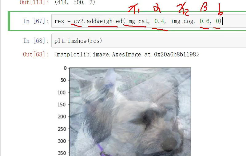 0.4是cat图像的权重,0.6是dog图像的权重,0是偏置项(给图像提亮多少)