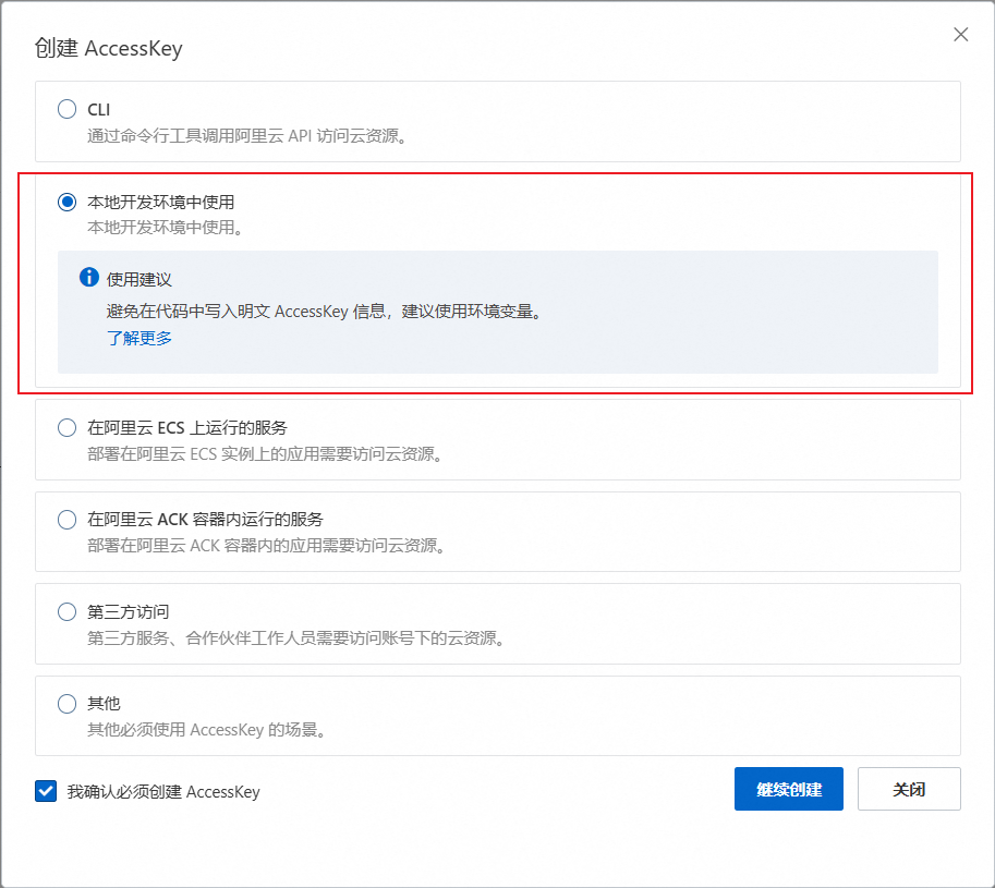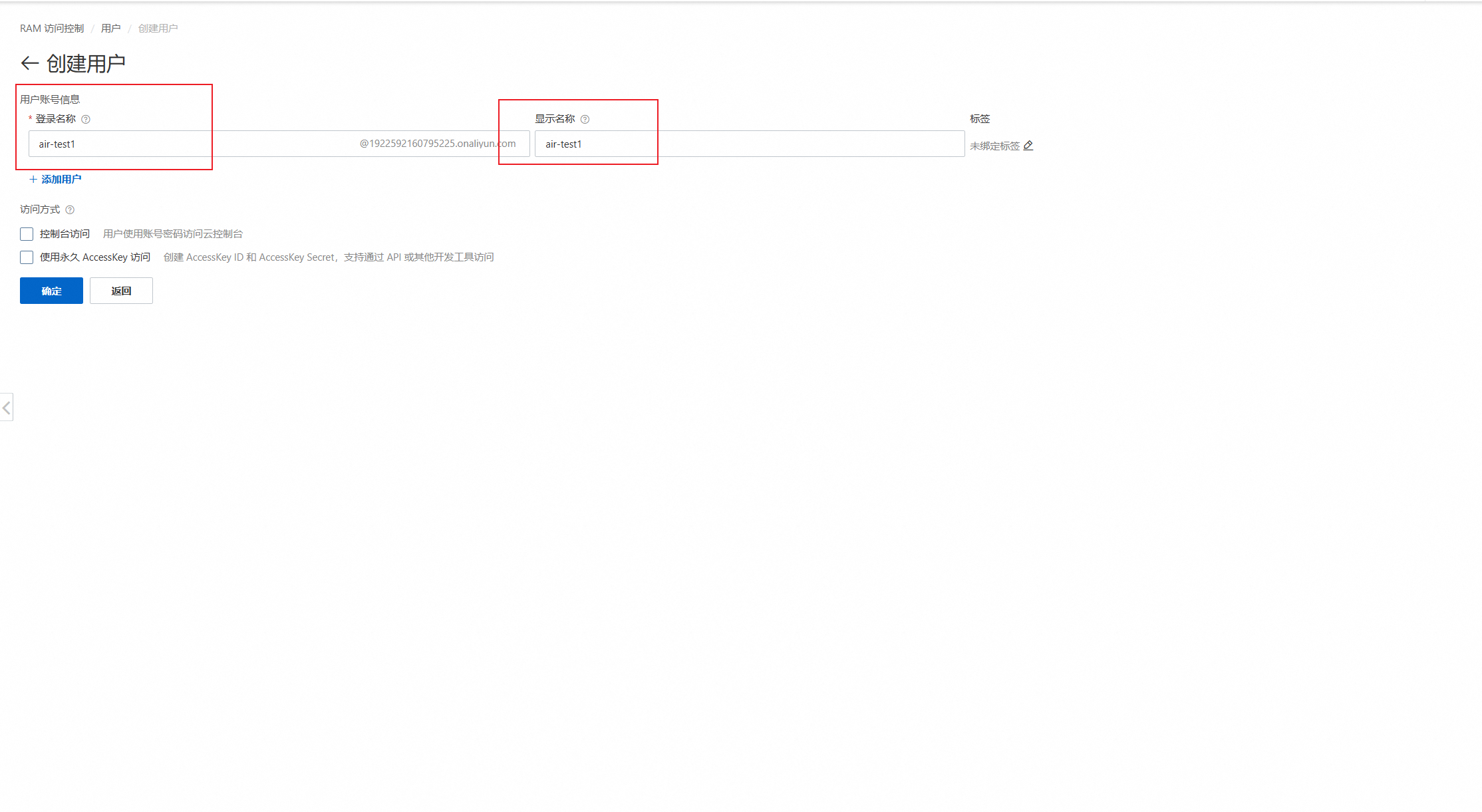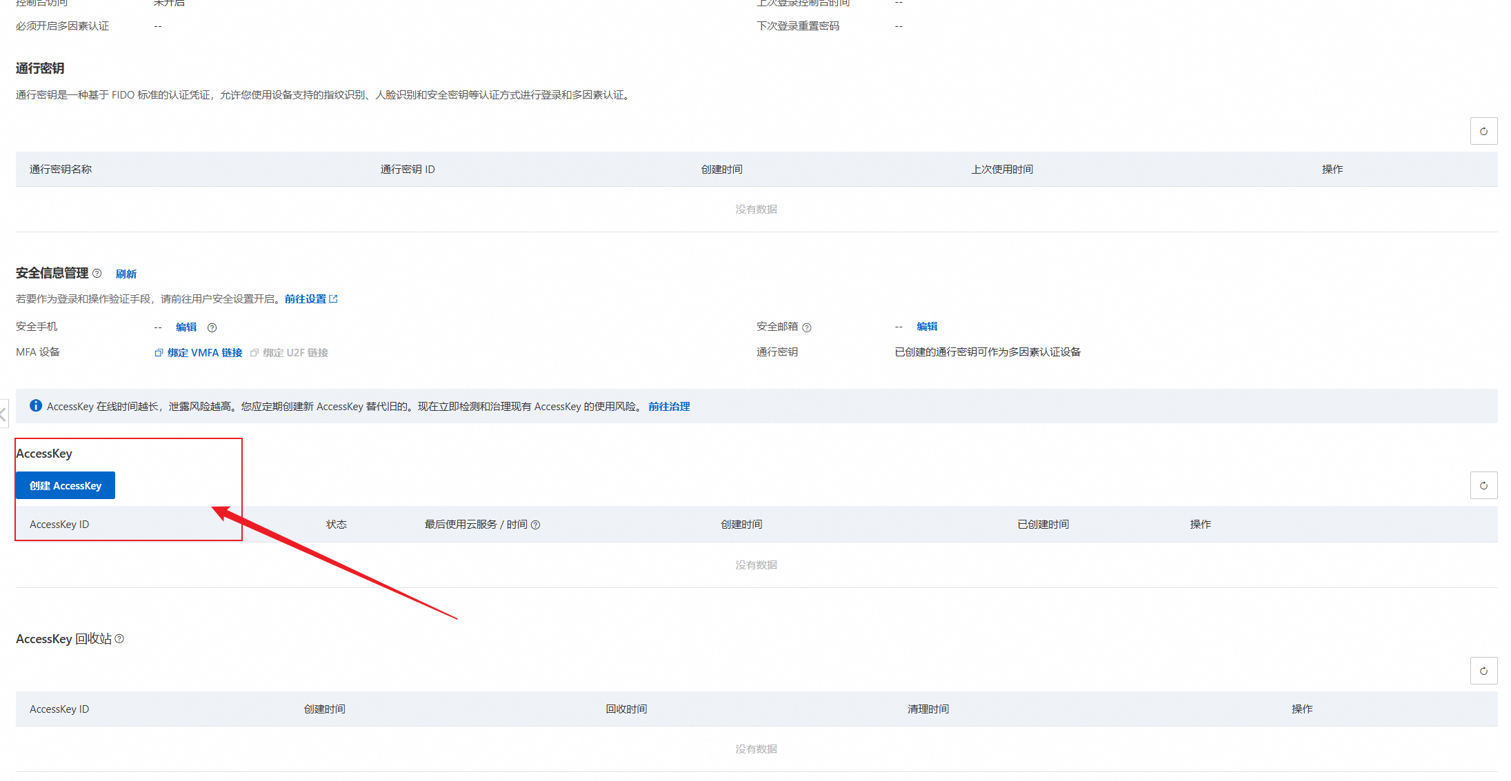 - 点击创建的用户,创建AccessKey(记住创建的AccessKey ID和AccessKey Secret)