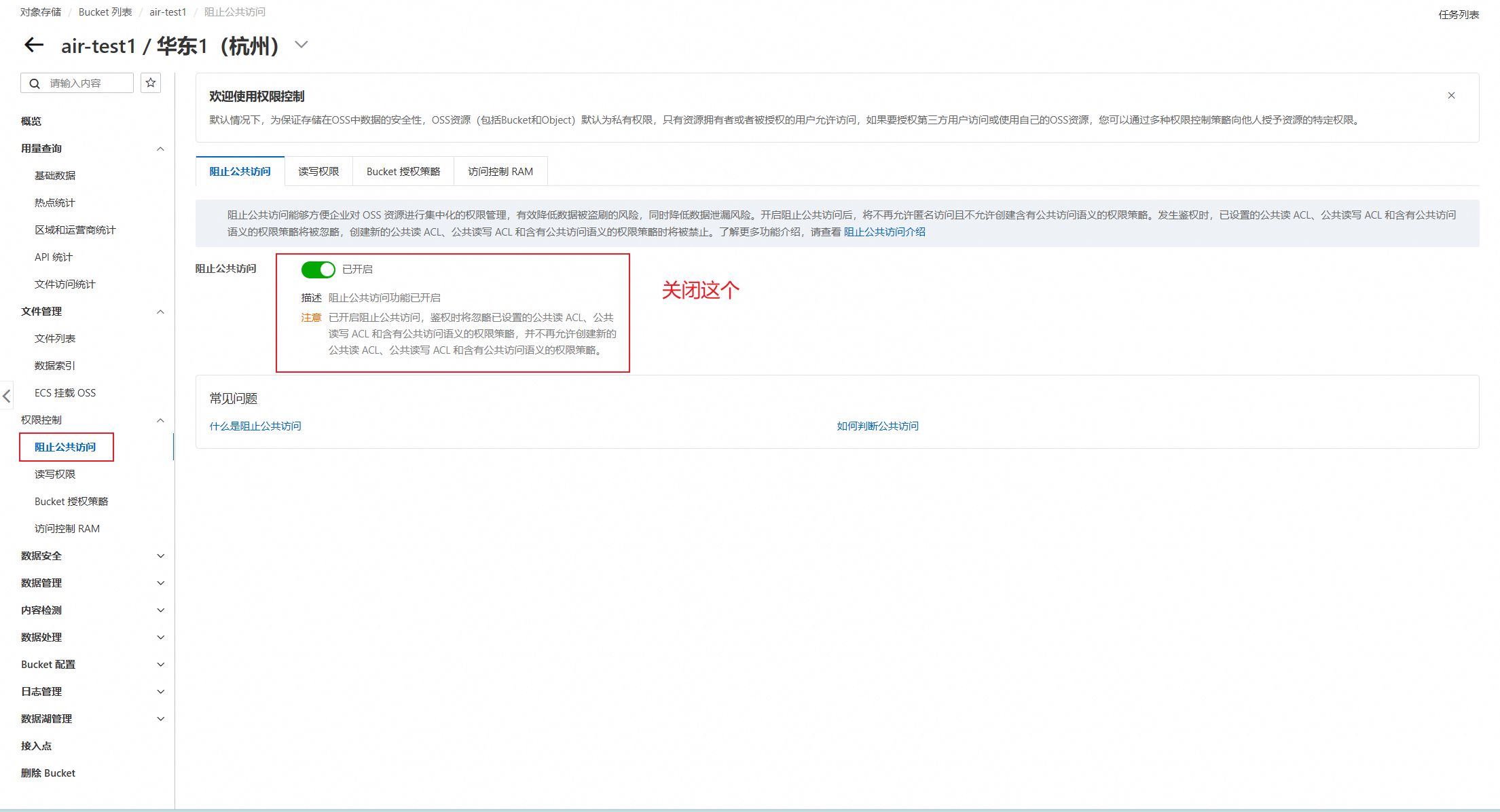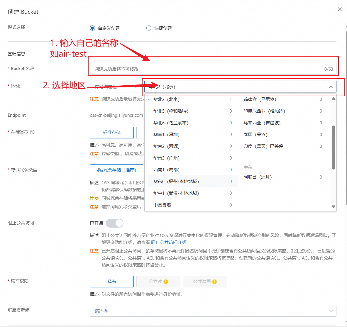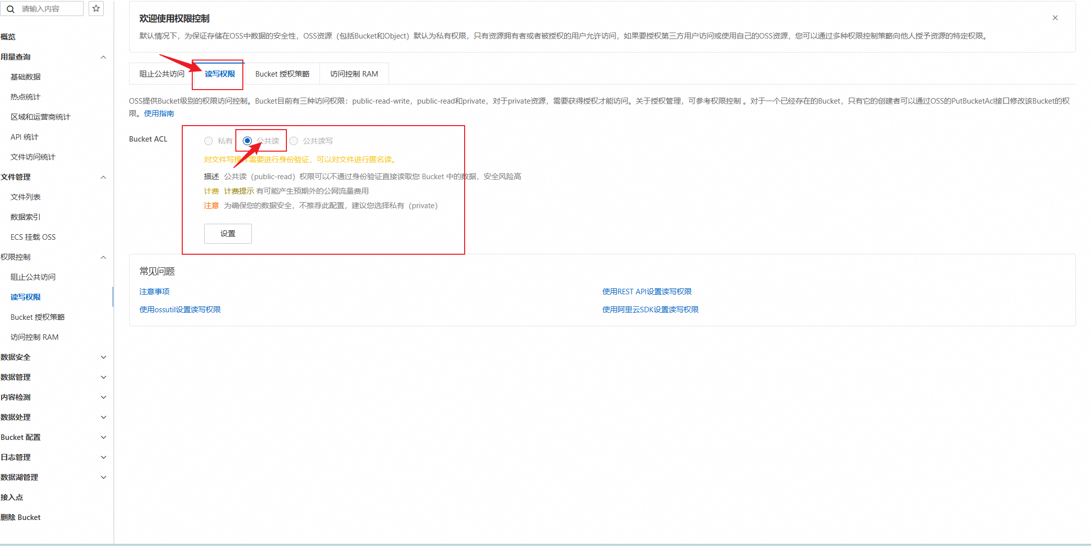 - 读写权限:公共读(如果不想设置公共读,需要使用签名URL)