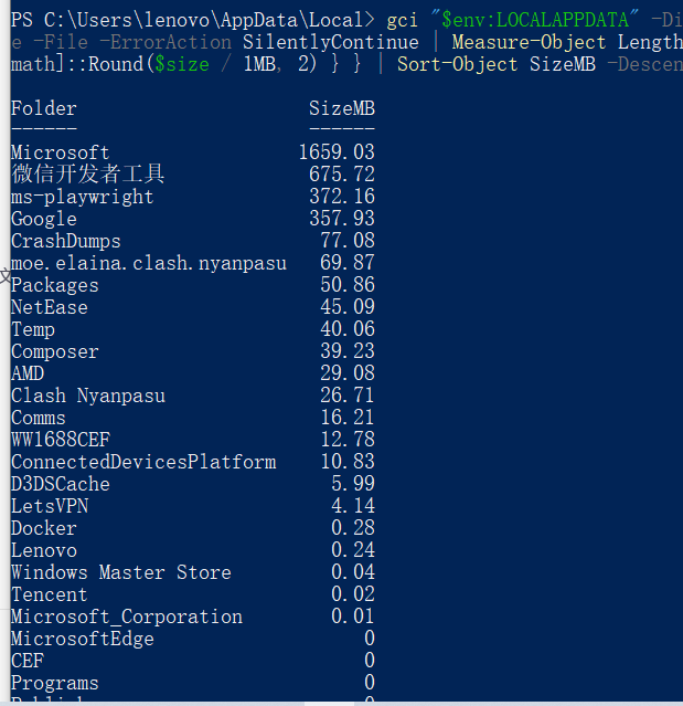 gci C:\ -Force -ErrorAction SilentlyContinue | ForEach-Object { $size = (gci $_.FullName -Recurse -Force -File -ErrorAction SilentlyContinue | Measure-Object Length -Sum).Sum; [PSCustomObject]@{ Name = $_.Name; SizeGB = [math]::Round($size / 1GB, 2) } } | Sort-Object SizeGB -Descending | Select-Object -First 10
