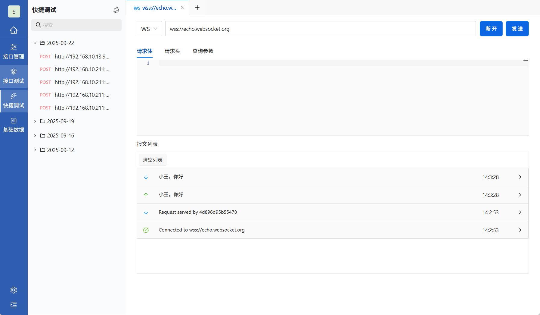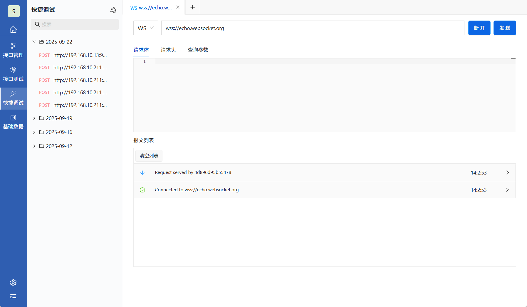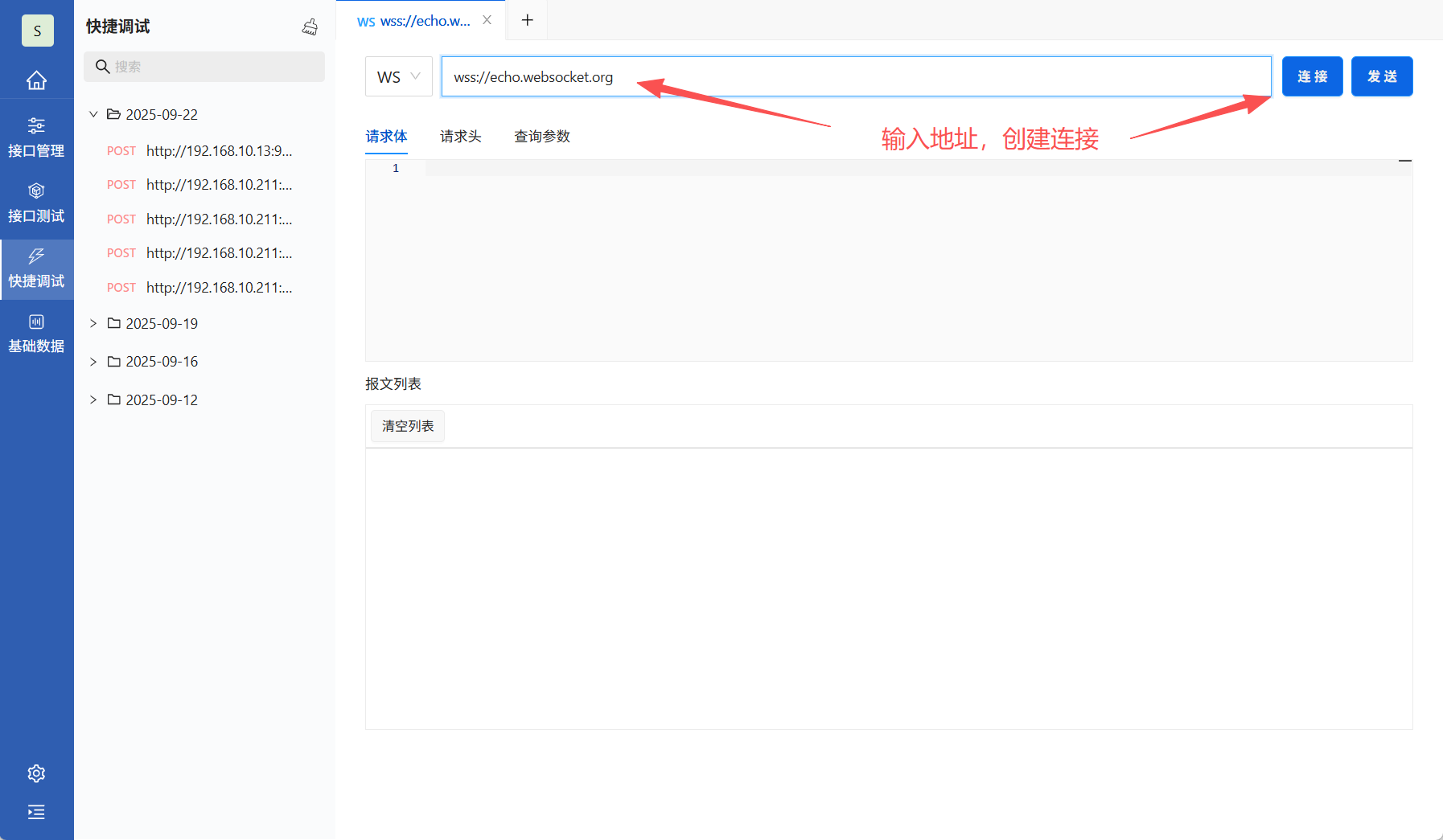 在接口调试页面选择WebSocket协议,界面显示WebSocket协议接口调试需要的项目。