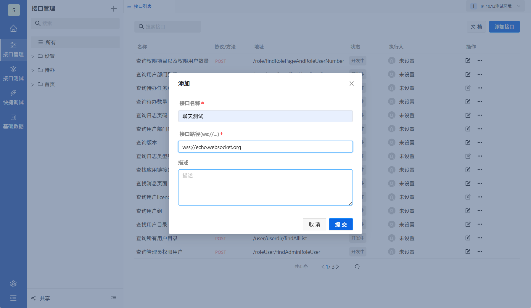 进入空间详情,在接口页面,接口以目录的形式进行分组。在目录右侧点击“+”,选择添加WebSocket协议接口,输入接口的基本信息接口名称、请求类型、接口路径,点击“提交”,成功添加接口。