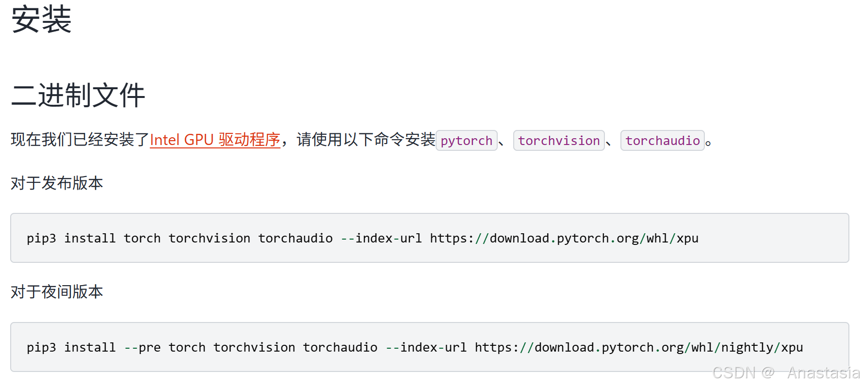 pip3 install torch torchvision torchaudio --index-url https://download.pytorch.org/whl/xpu
