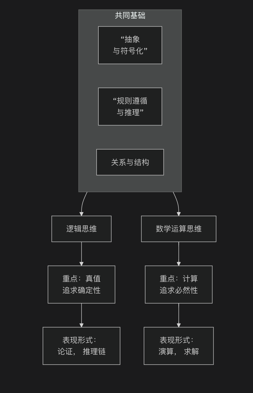 可以说,逻辑更侧重于“推断”,而数学运算更侧重于“变换”。但深究下去,推断也是一种变换(真值的变换),变换也需要逻辑来保证其正确性。它们在最深的层次上是相通的,共同构成了人类理性的两大支柱。