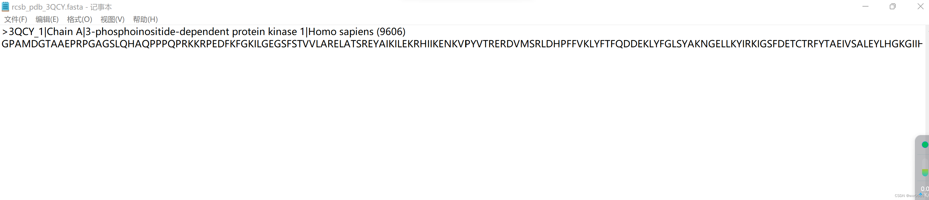 点开下载的fasta文件就可以查看<PDB_ID>为3QCY的序列了
