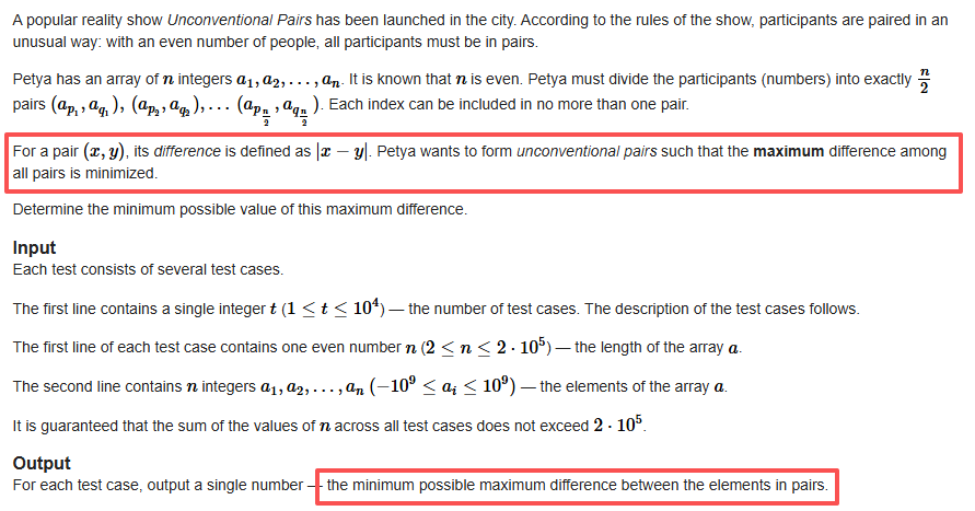 Pet wants to form unconventional pairs such that the maximum difference amongall pairs is minimized.Detemine the minimun possible value of this maximum difference. Example