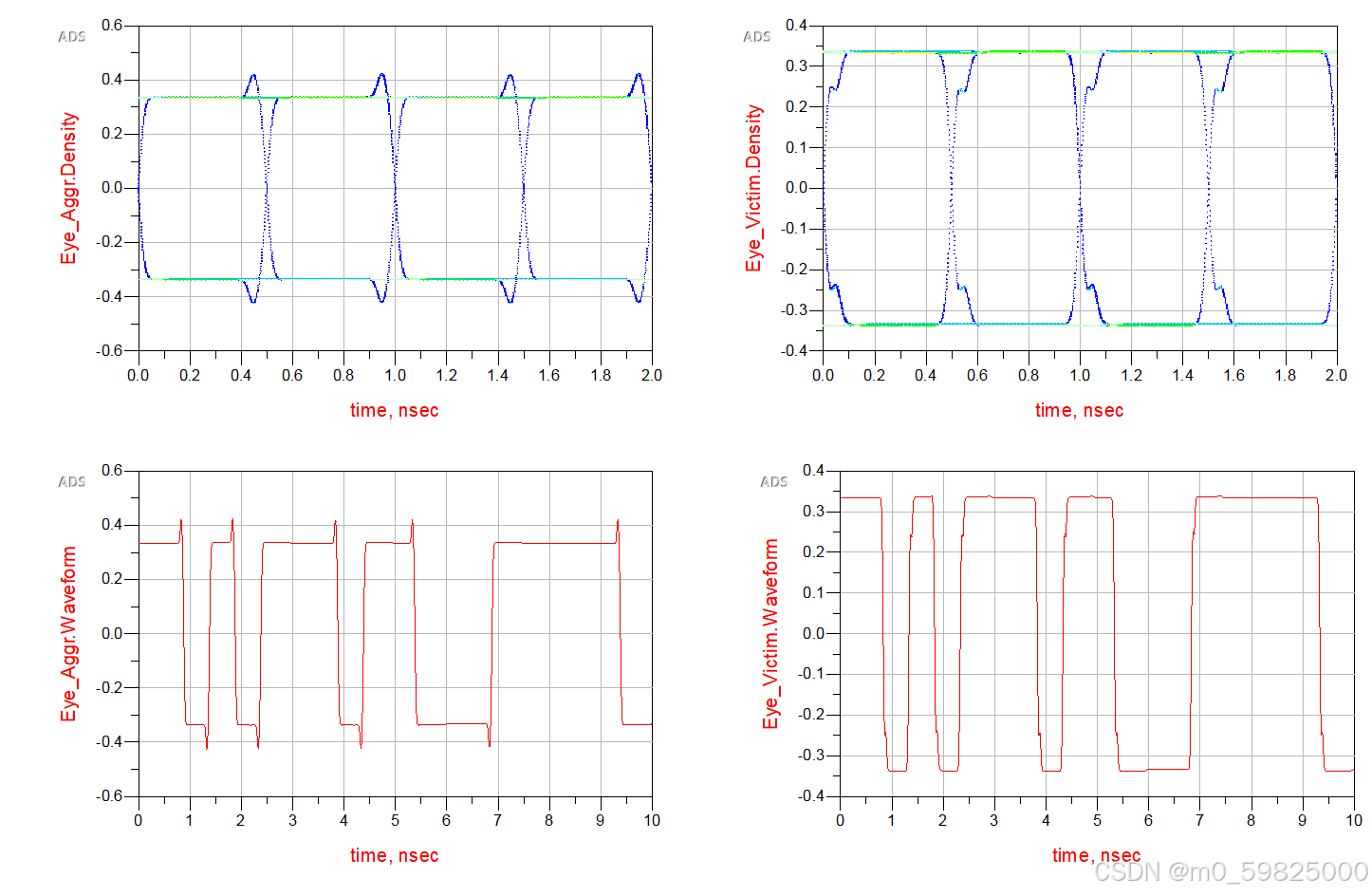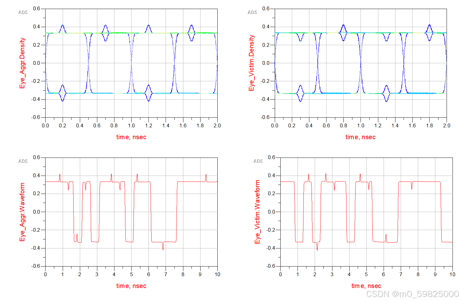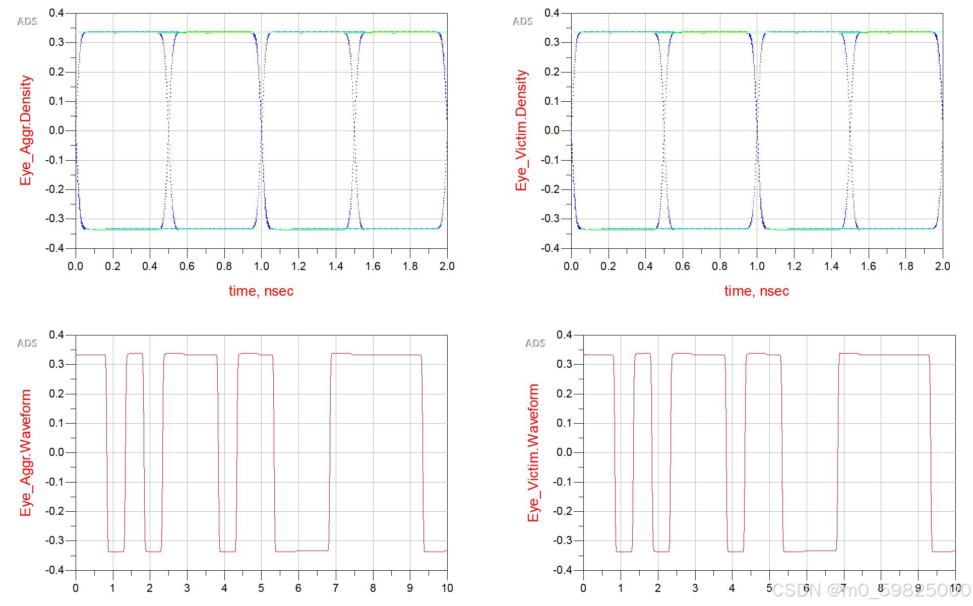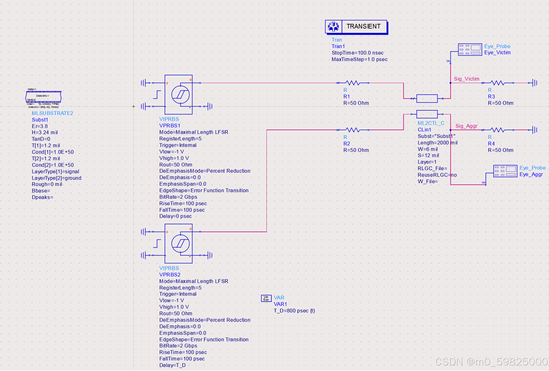 使用ADS仿真通过眼图观察串扰对信号的影响,使用两组PRBS信号,调整第二组PRBS信号的延迟时间,观察眼图变化: