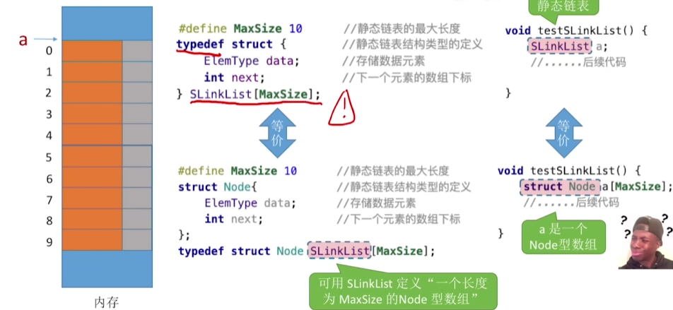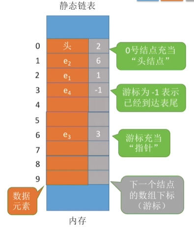 分配一整片连续空间内存的链表,各个节点集中安置。所以它的最大容量是不能变的。(用的很少,操作系统的文件分配表FAT就是静态链表)