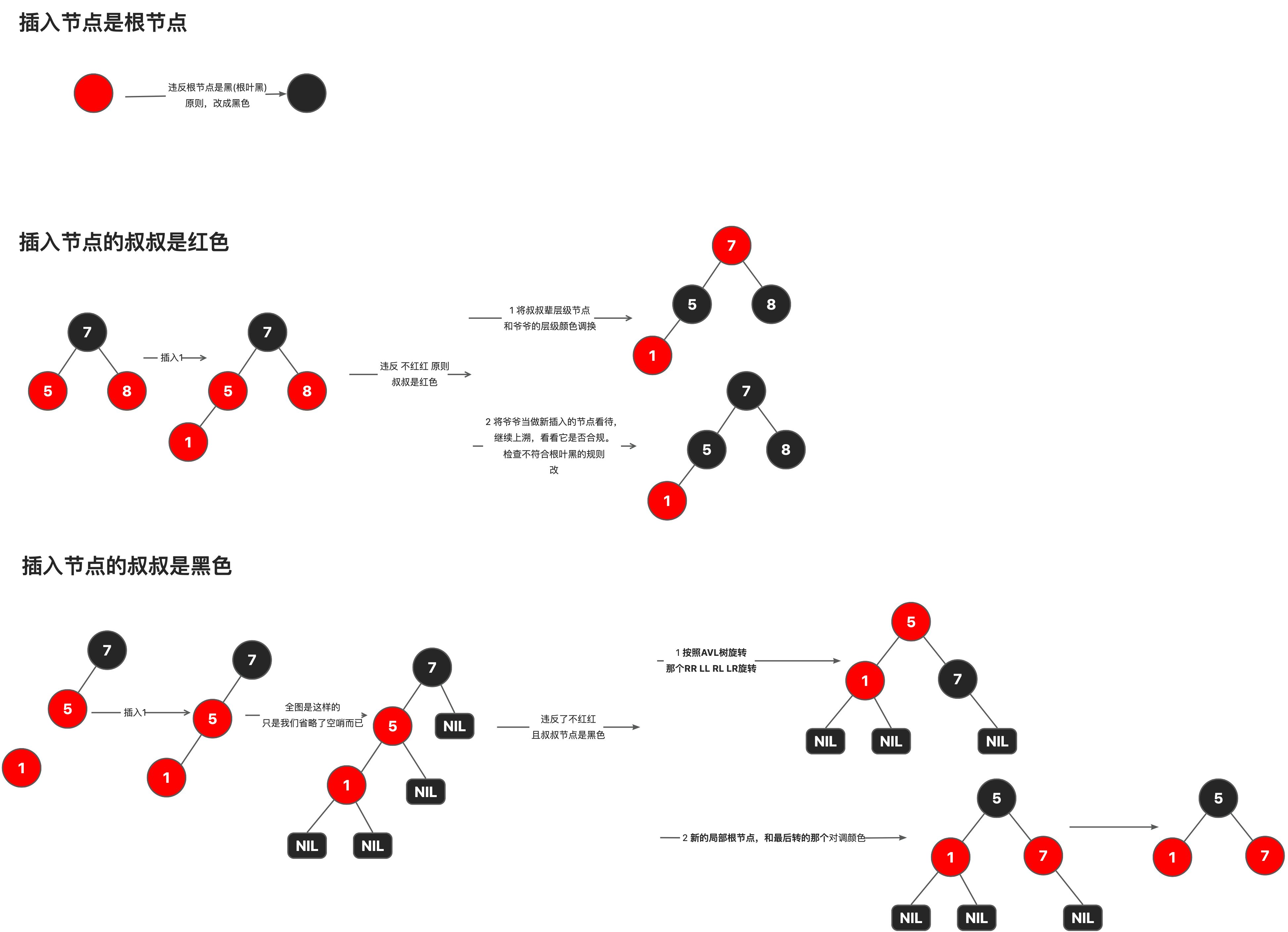 - 落的新点,全都按做是红色节点,注意这时候判断失衡已经不是计算层高了,而是看是不是两个红色的相连。两个红色相连就得调整!因为已经不符合“红色节点的子节点一定为黑”这个规则了。