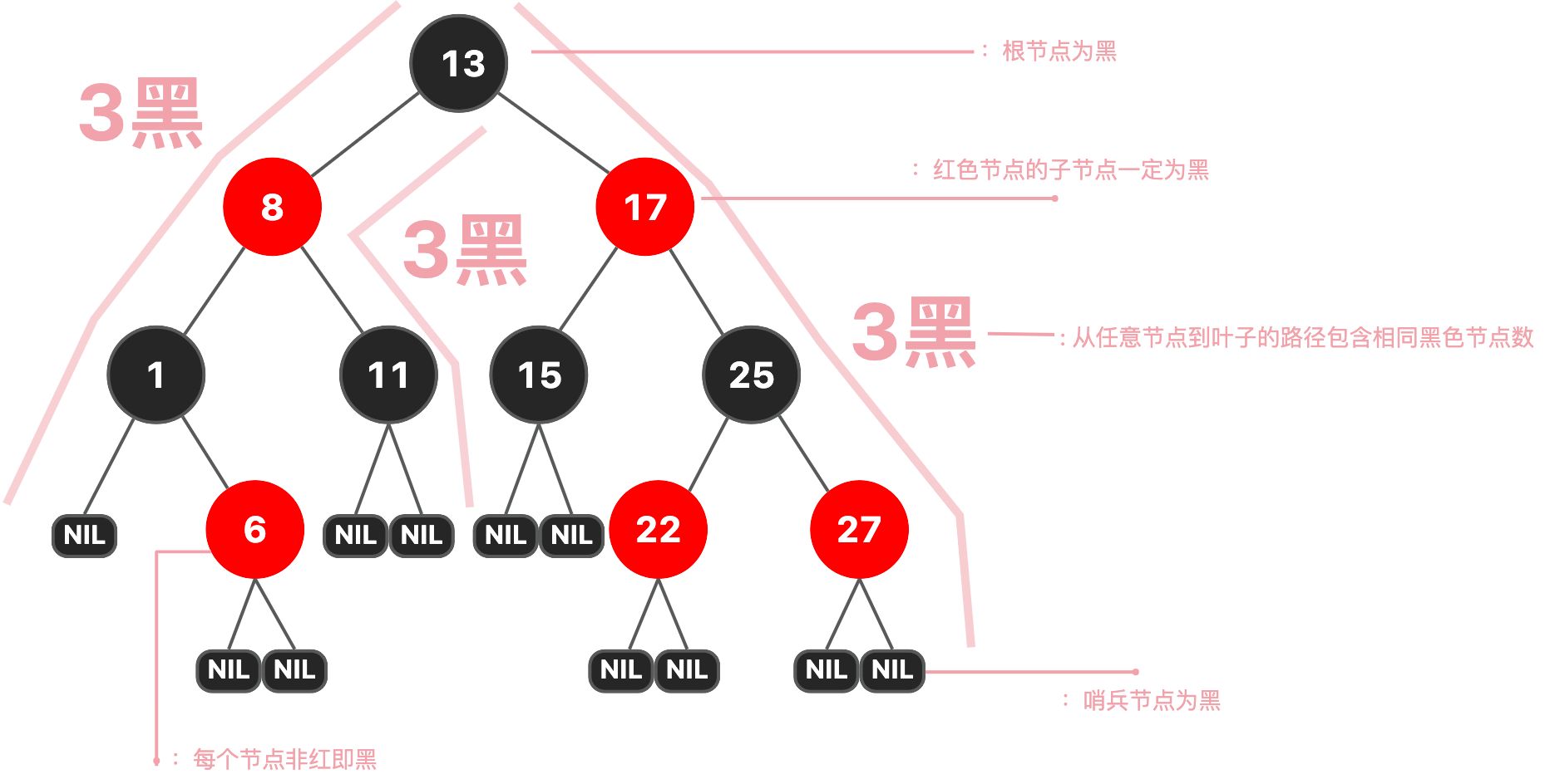 - 黑路同: 代表根节点到各大叶子节点经历的黑色节点是一样的数量。