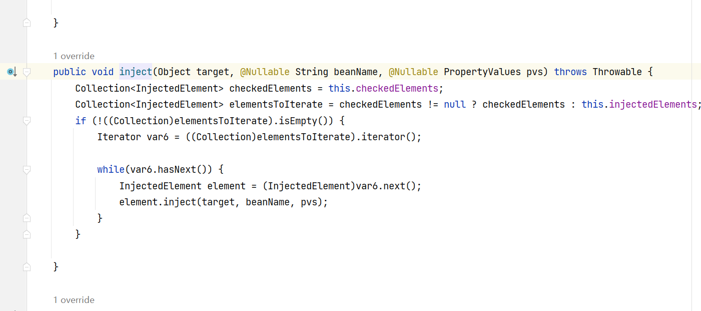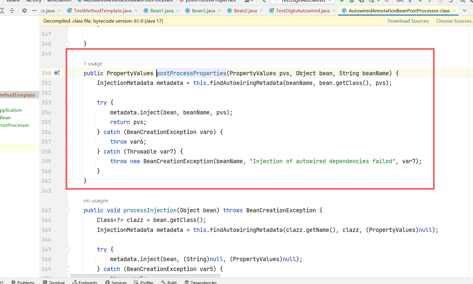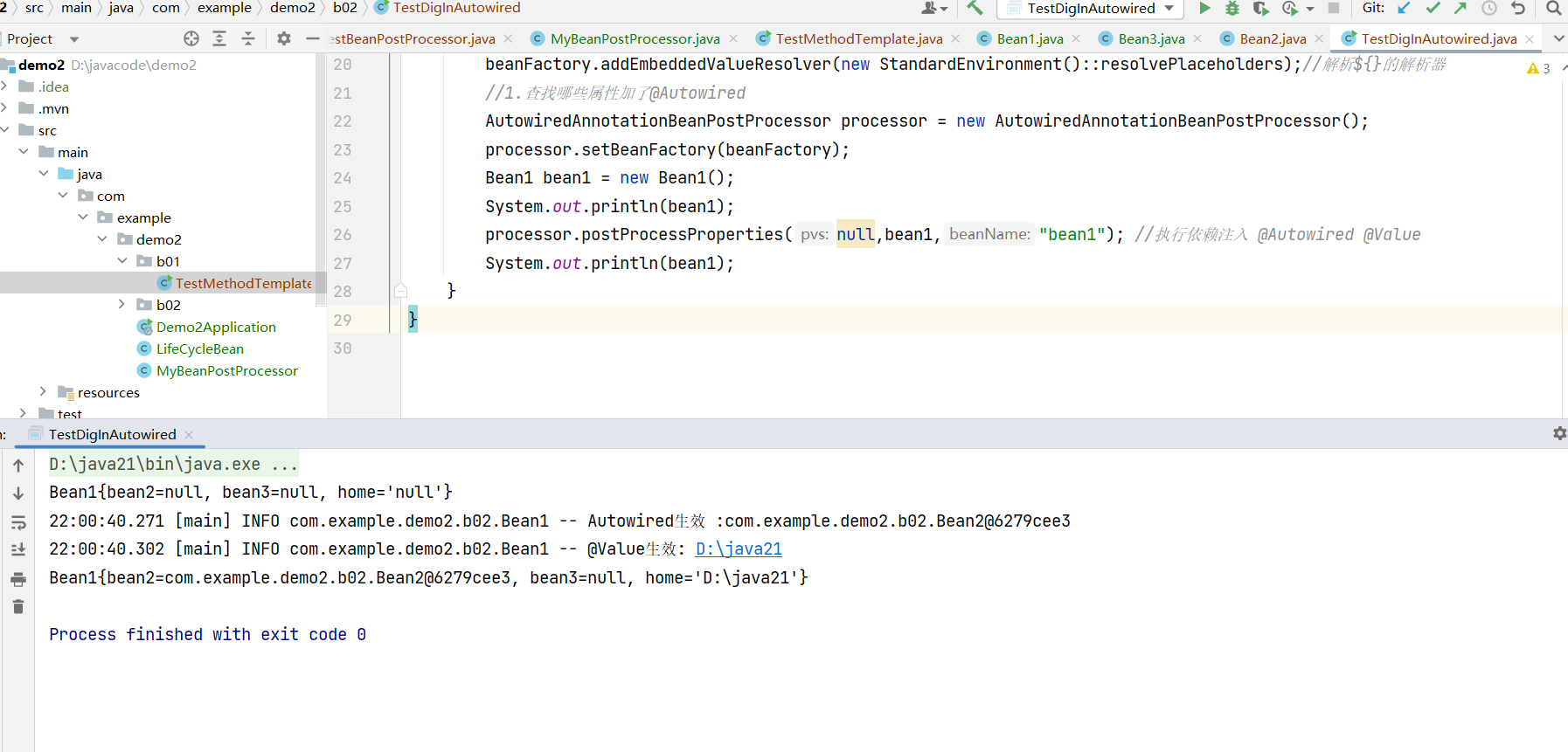 public class TestDigInAutowired {public static void main(String[] args) {DefaultListableBeanFactory beanFactory = new DefaultListableBeanFactory();beanFactory.registerSingleton("bean2",new Bean2());beanFactory.registerSingleton("bean3",new Bean3());beanFactory.setAutowireCandidateResolver(new ContextAnnotationAutowireCandidateResolver());//解析@valuebeanFactory.addEmbeddedValueResolver(new StandardEnvironment()::resolvePlaceholders);//解析${}的解析器//1.查找哪些属性加了@AutowiredAutowiredAnnotationBeanPostProcessor processor = new AutowiredAnnotationBeanPostProcessor();processor.setBeanFactory(beanFactory);Bean1 bean1 = new Bean1();System.out.println(bean1);processor.postProcessProperties(null,bean1,"bean1"); //执行依赖注入 @Autowired @ValueSystem.out.println(bean1);}