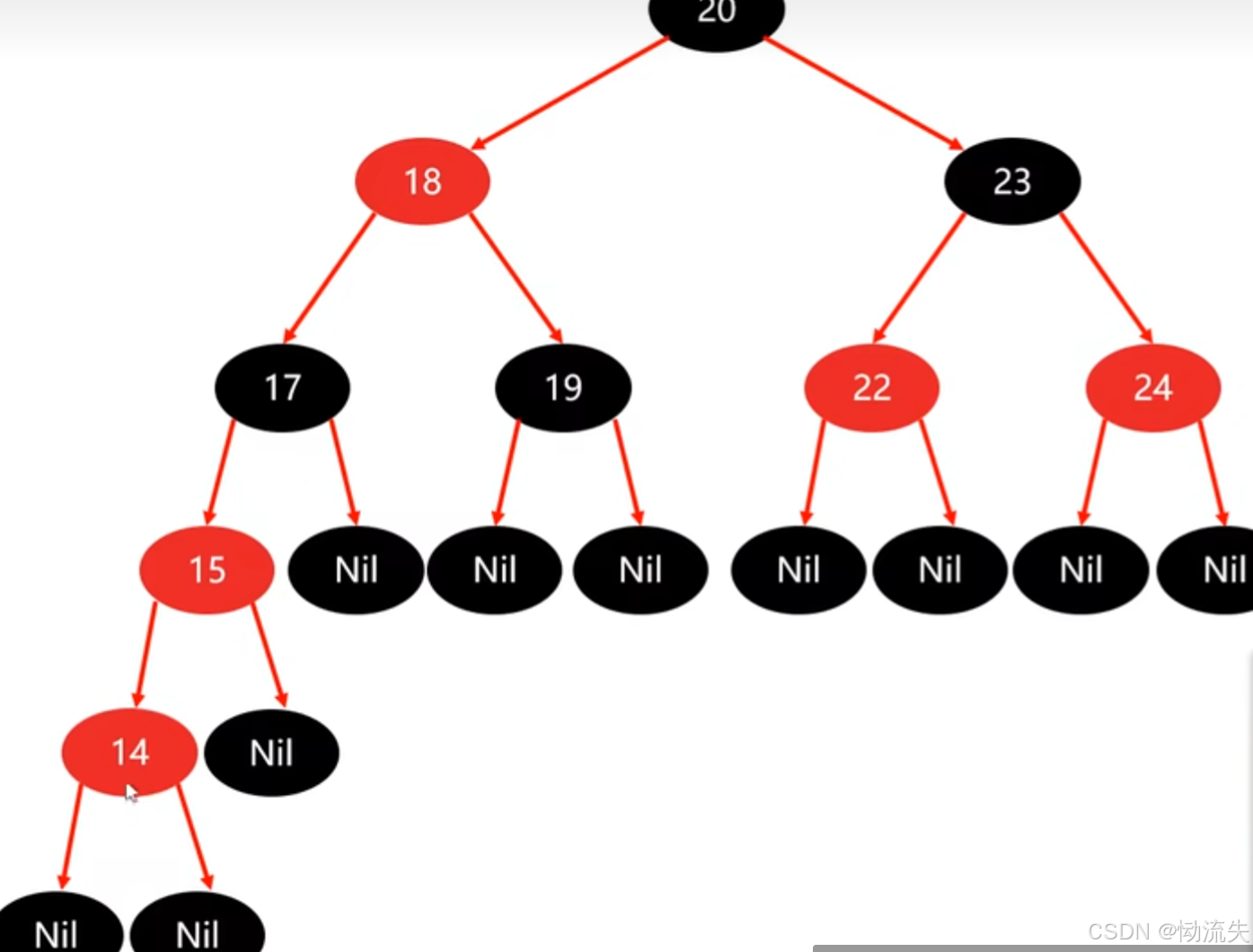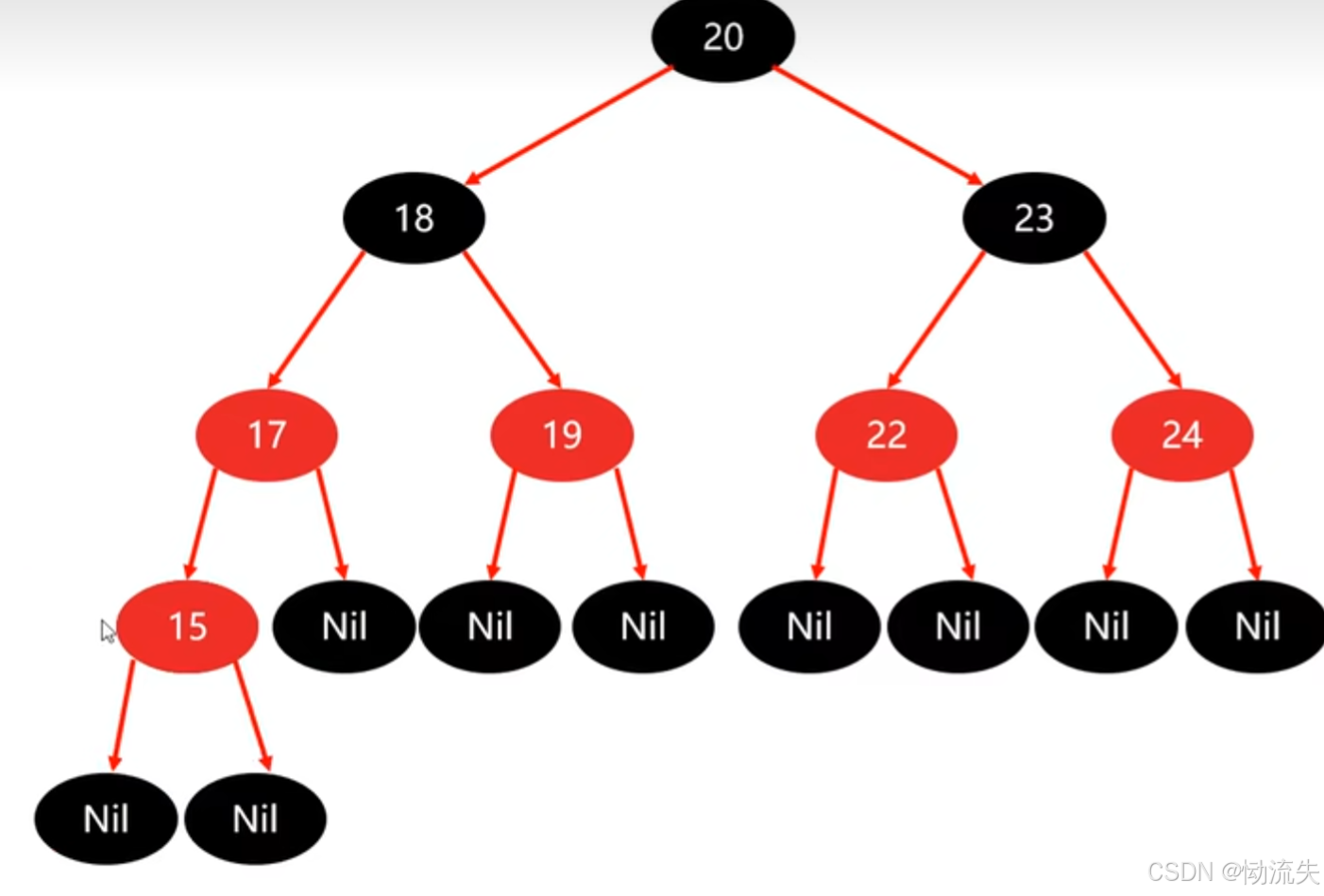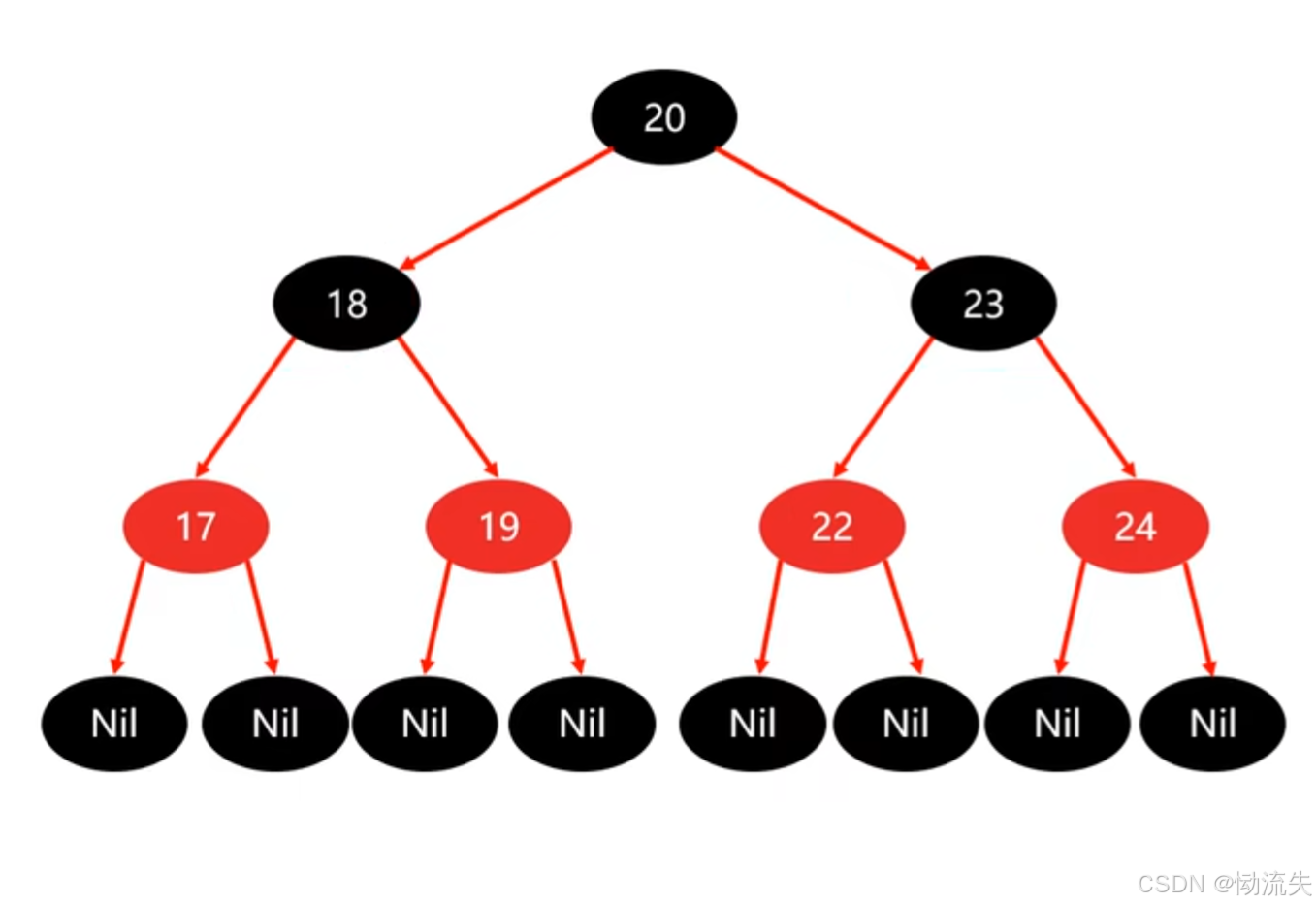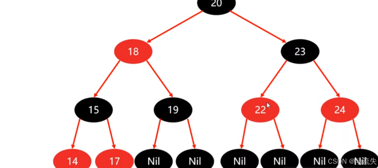 - 对每一个节点,从该节点到其所有后代叶节点(nil)的简单路径(只能往前,不能回头)上,均包含相同数目的黑色节点
