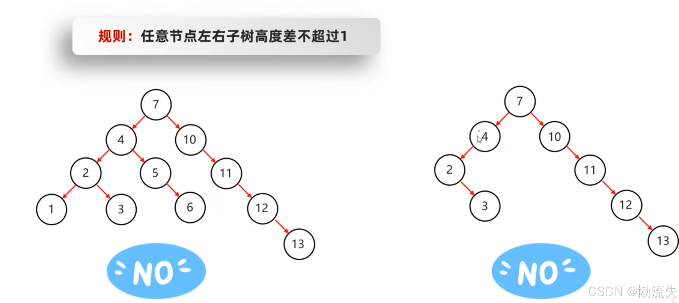 原因:第一棵树中''10''这个节点左子树高度0,右子树高度3,相差超过1,所以不是平衡二叉树