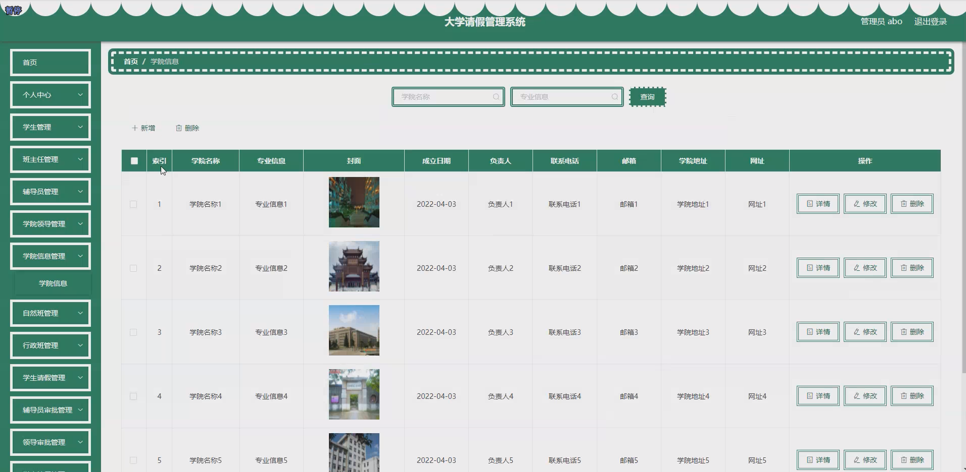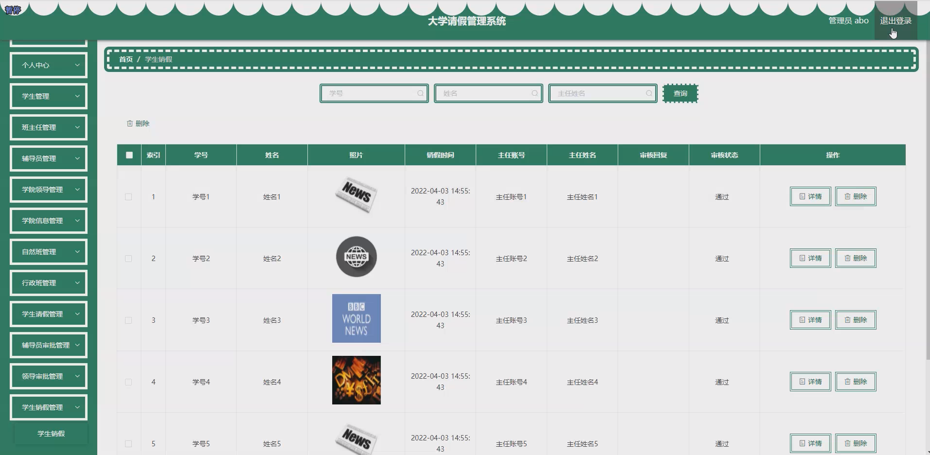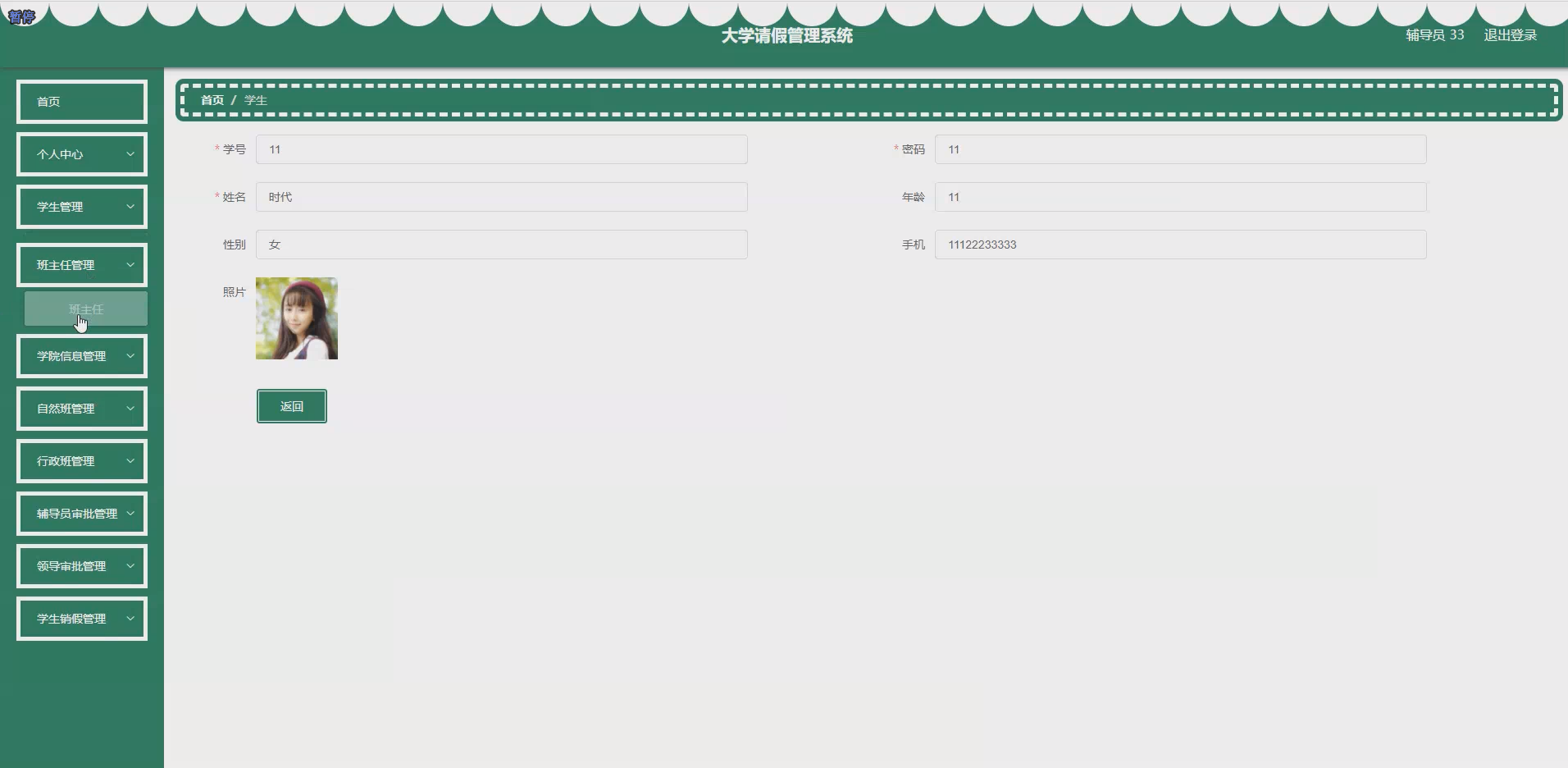 学院信息,自然班,行政班,学生,班主任,辅导员,学院领导,学生请假,辅导员审批,领导审批,学生销假