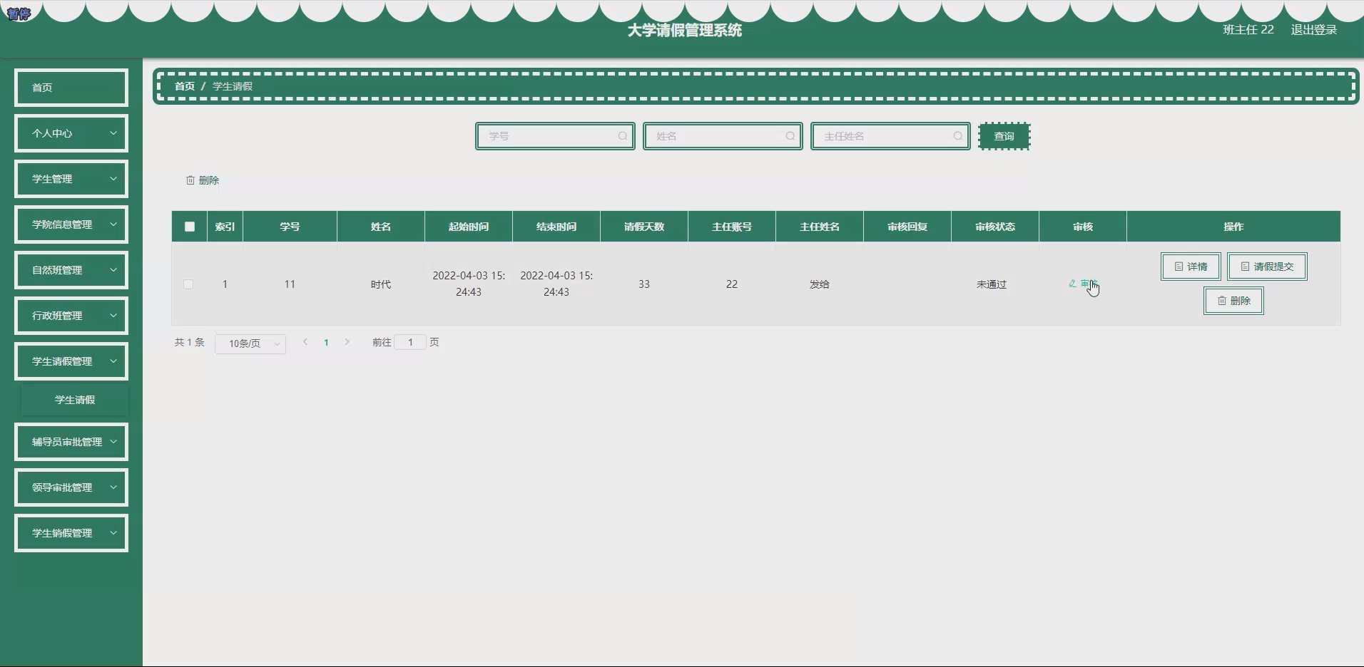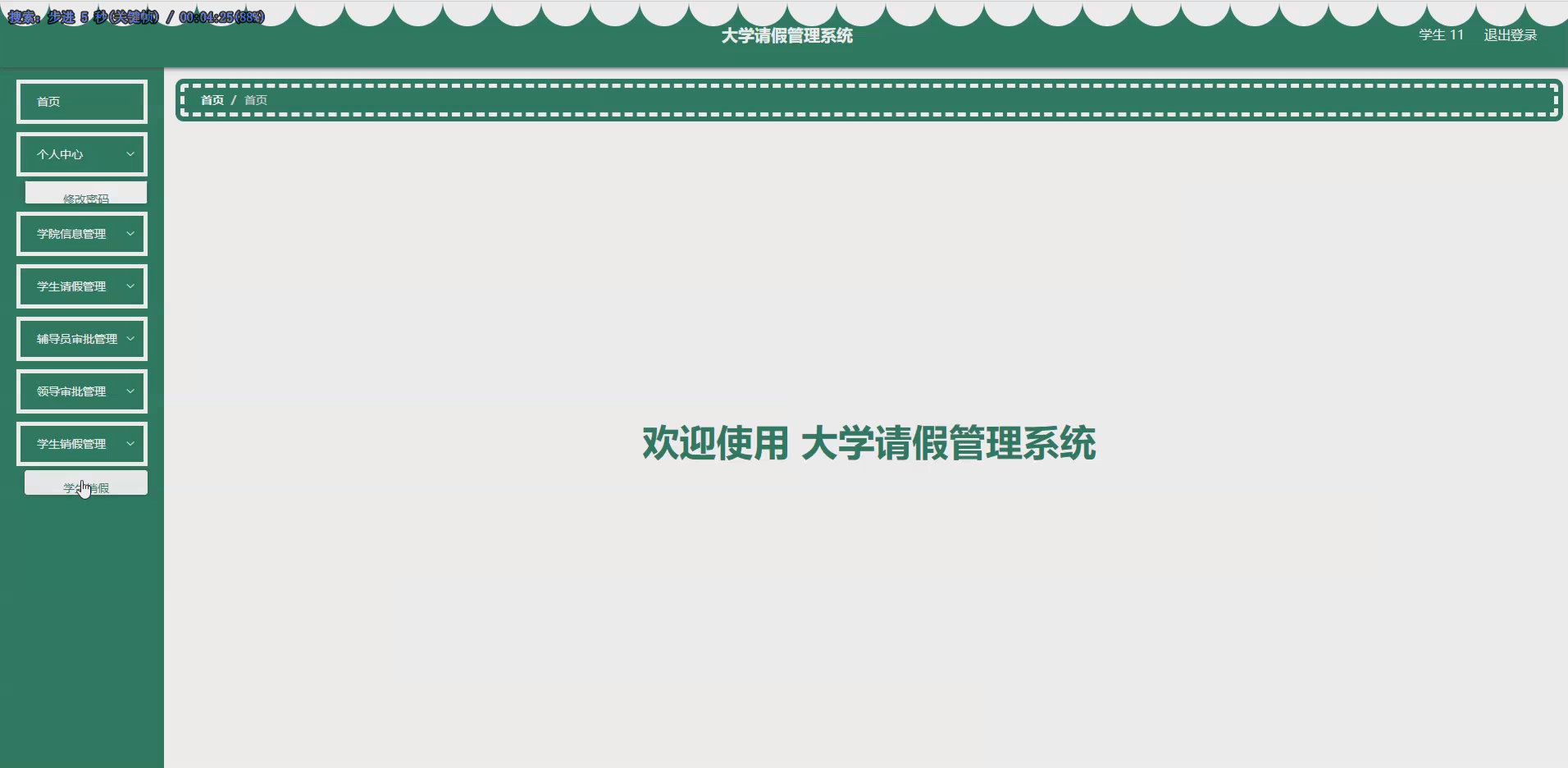 - 基于 SSM 框架,开发一套功能完善、操作便捷、性能稳定的大学请假管理系统,覆盖学生请假申请、教师 / 管理员审批、数据统计等核心场景。