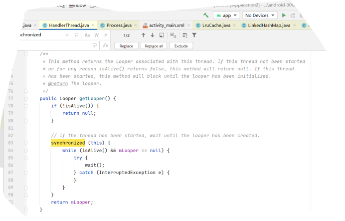 获取这个HandlerThread的Looper对象。调用这个方法时,如果looper对象还没生成,该方法会短暂阻塞当前调用线程(86行的wait方法等待looper对象生成后唤醒)。 当该HandlerThread启动后,会调用notifyAll唤醒当前线程。