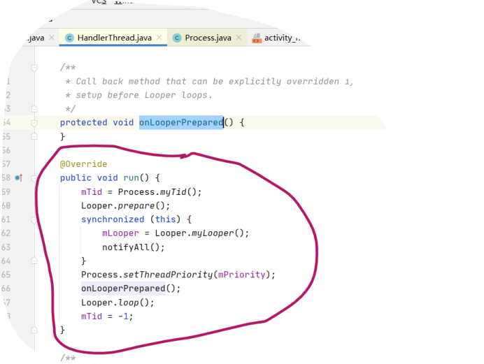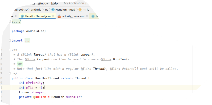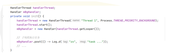可以看出HandlerThread用于实现多线程任务处理,其封装了Looper初始化及其消息循环。 实际开发中,这样使用,代码如下。注意,需要先启动HandlerThread再获取其Looper对象,不然获取不到looper对象。
