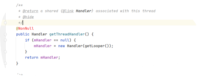 返回一个handler,用于处理该线程消息。这是一个隐藏api。实际需要启动该handlerThread后自己构造这个handler