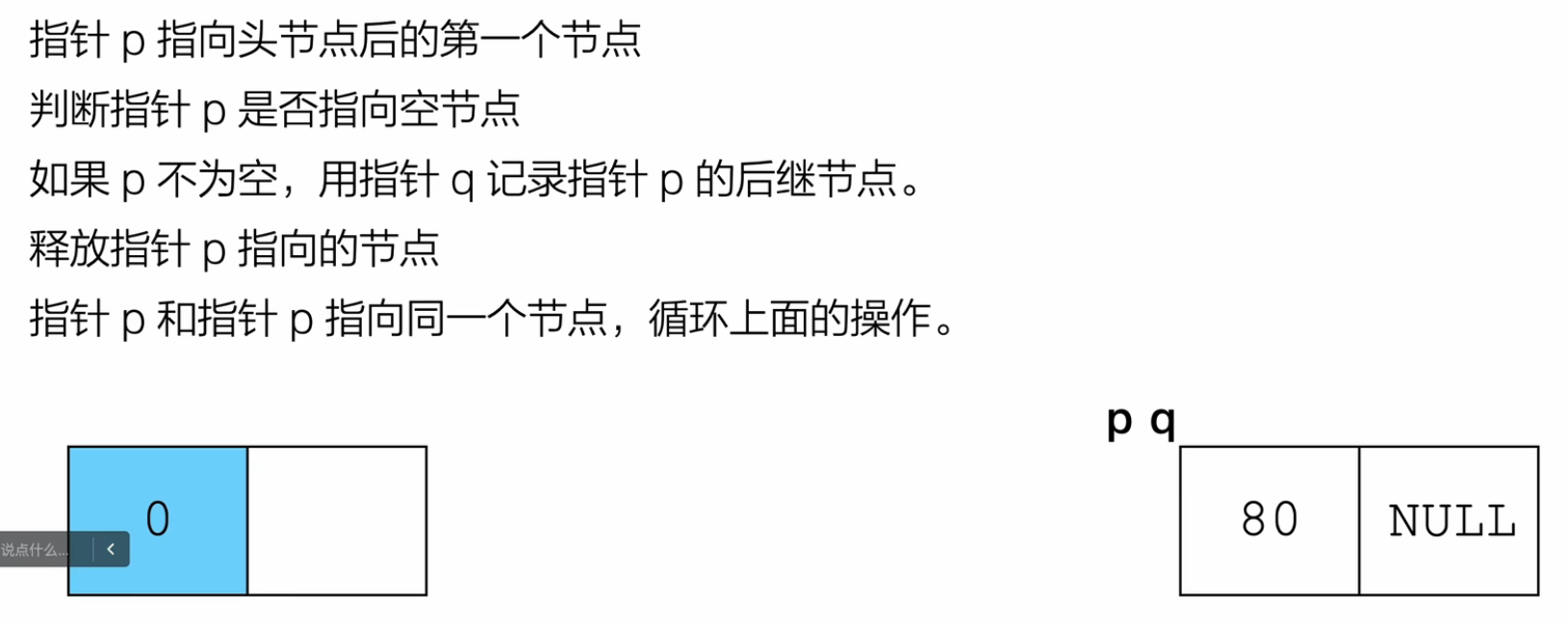 void DestroyList(Node* L) {Node* per = L;Node* p = L->next;while (per != NULL) {free(per);per = p;p = p->next;}free(per);