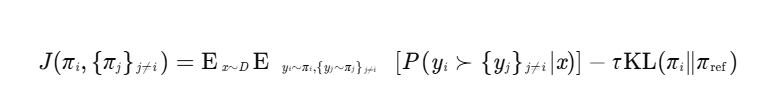 具体来说,每个策略的目标是最大化其相对于其他所有策略的平均偏好概率,同时通过KL散度正则化项保持与参考模型的接近。目标函数可以表示为: