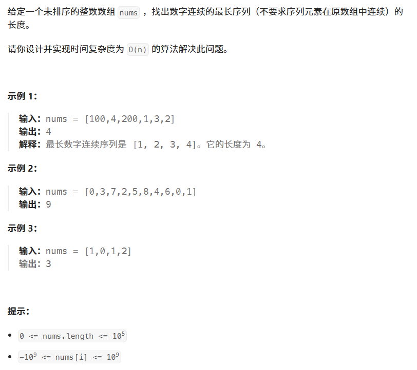 class Solution {public int longestConsecutive(int[] nums) {Set<Integer> set = new HashSet();for (int i : nums) set.add(i);int max = 0;for (int num : set) {if (set.contains(num - 1)) continue; // 上一个数存在,说明当前数不是连续片段的开头int cur = num; // 当前数int curLen = 0; // 当前长度// HashSet加速查找下一个数是否存在,更新最大长度while (set.contains(cur++)) {curLen++;max = Math.max(max, curLen);}}return max;}