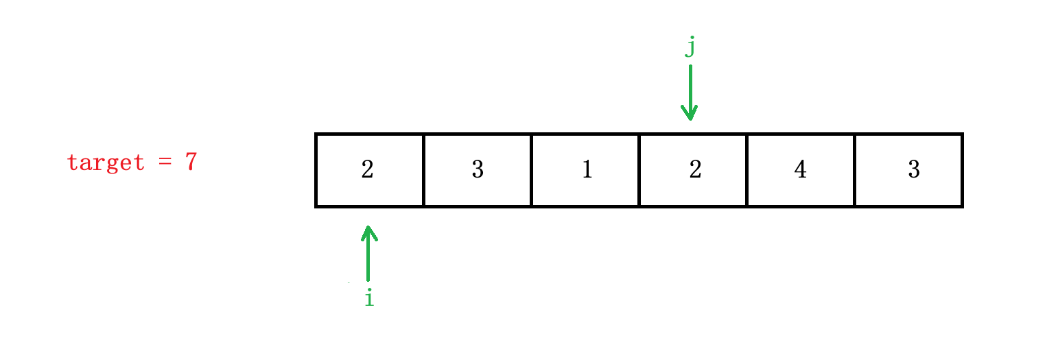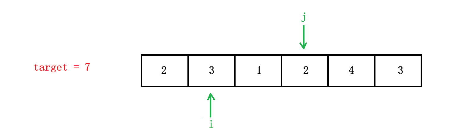 当 i = 1 时,暴力解法中需要 j 从 i 这个位置开始遍历,求 sum,但是其实 sum 可以由上一种情况直接求得,直接用 sum -= nums[i] 就可以求出 sum 了,所以 j 是无需向后走的,分析到这我们可以发现其实 i 和 j 是同向移动的,所以我们可以采用滑动窗口算法来解决这个问题。