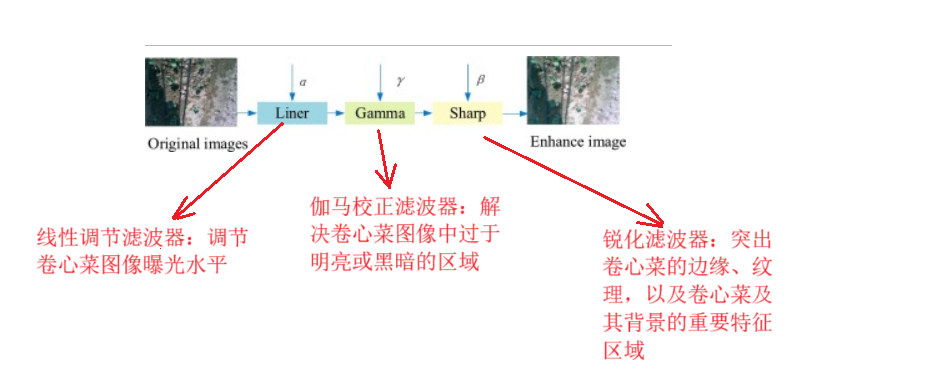 滤波器自适应参数学习模块首先将原始图像调整为256*256像素,最后滤波器需要的参数通过一个完全连接的层输出,滤镜组合中输入的图像经过线性调整、伽马校正和锐化,生成增强的卷心菜图像特征
