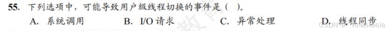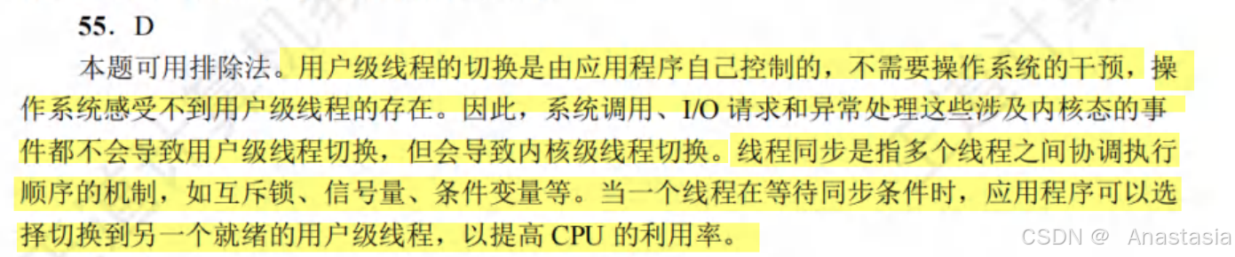 用户级线程:用户级线程是由用户程序或函数库实现的,不依赖于操作系统的支持。用户级线程对操作系统是透明的,CPU调度的对象仍然是进程。用户级线程是在用户空间中实现的,用户级线程只能在用户态运行。