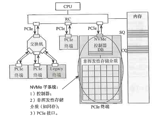 如上图所示,SSD 作为一个 PCIe Endpoint(PCIe 终端,简称 EP)通过 PCIe 连着 RC,然后 RC 连接着 CPU 和内存。尽管 CPU 不直接与 SSD 交互,但SSD 的地位还是较过去提升了一级,过去 SSD 别说直接接触 CPU,就是连 RC 的面都见不到,SSD 和 RC 之间还隔着一座南桥。
