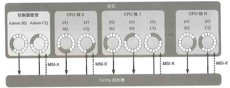 Admin 和 I/O 两种类型的 SQ/CQ,前者发送 Admin 命令,后者发送 I/O 命令;