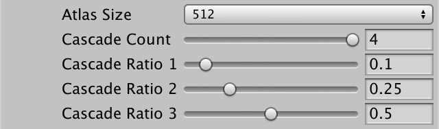 public enum CascadeBlendMode {Hard, Soft, Dither}public CascadeBlendMode cascadeBlend;}public Directional directional = new Directional {…cascadeFade = 0.1f,cascadeBlend = Directional.CascadeBlendMode.Hard};