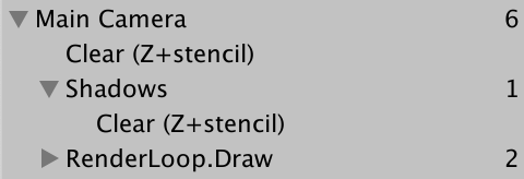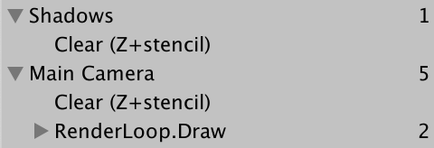 我们可以在设置光照前开始采样,并在光照设置完成后、清除相机目标前立即结束采样,这样就能将阴影条目嵌套在相机条目内显示在帧调试器中。