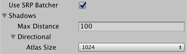 然后为阴影贴图添加一个默认值为1024的尺寸字段。我们将使用单一纹理来容纳多个阴影贴图,因此将其命名为atlasSize。由于目前仅支持定向光源,此时我们仅处理定向光源阴影贴图。但未来我们将支持其他光源类型,它们会有各自的阴影设置。因此请将atlasSize放在内部的Directional结构体中,这样就能在检查器中自动获得分层配置结构。