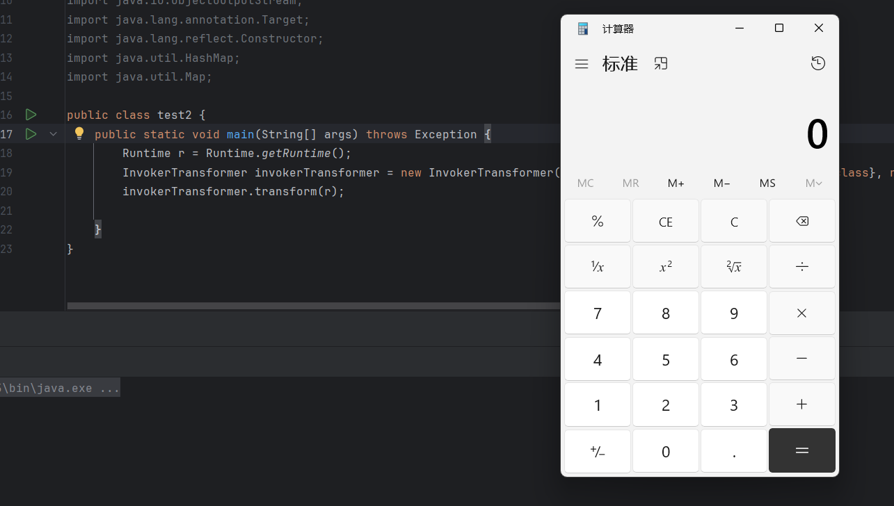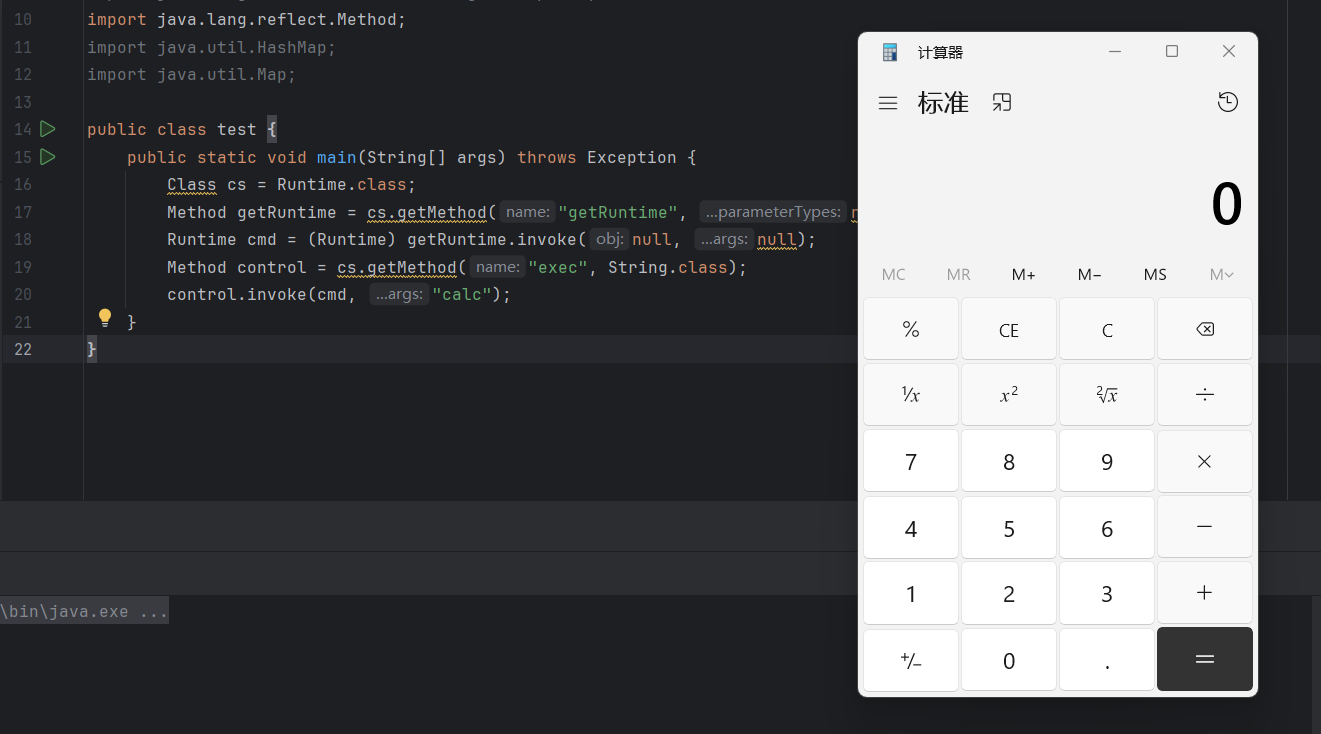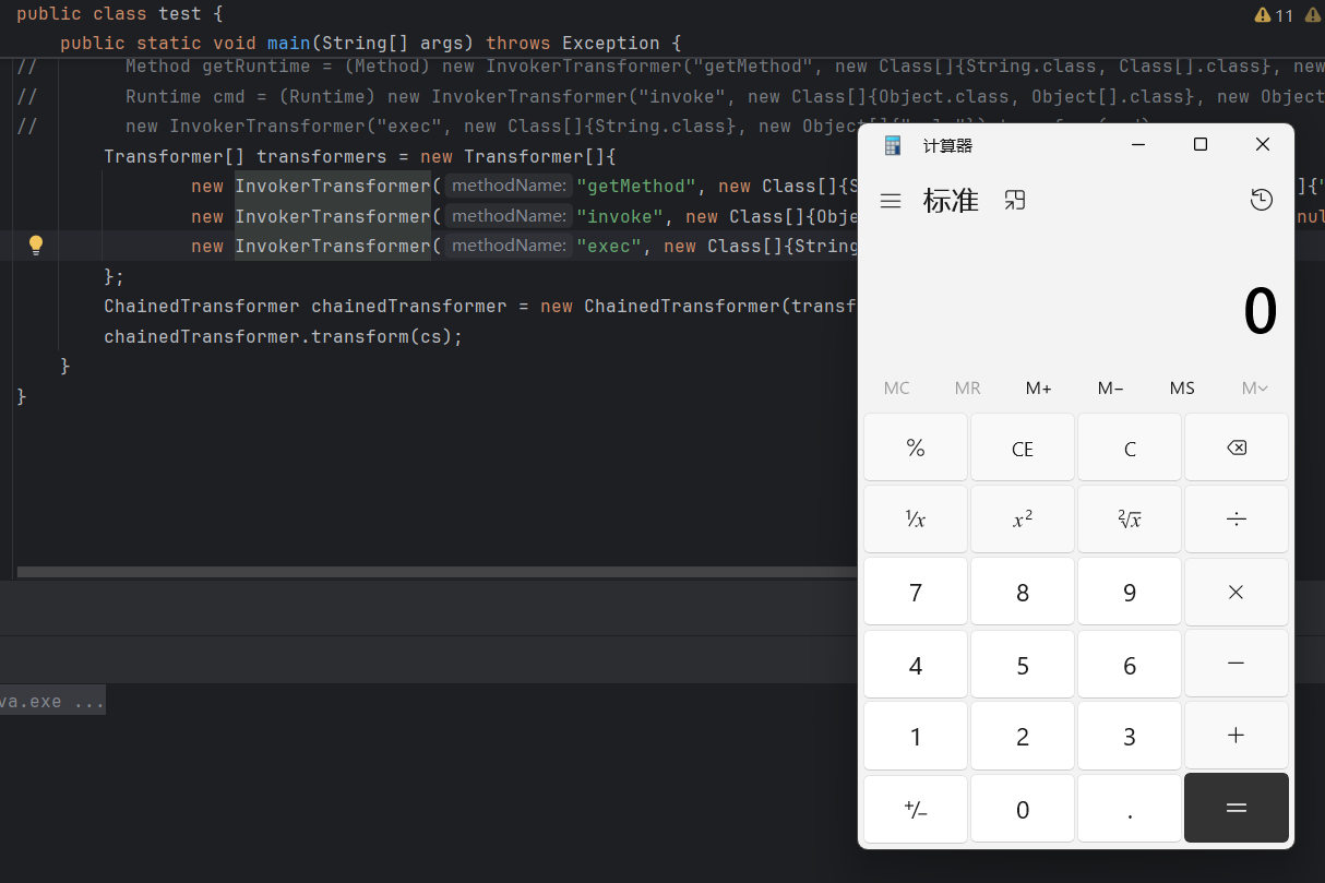public class test2 {public static void main(String[] args) throws Exception {Runtime r = Runtime.getRuntime();InvokerTransformer invokerTransformer = new InvokerTransformer("exec", new Class[]{String.class}, new Object[]{"calc"});invokerTransformer.transform(r);}