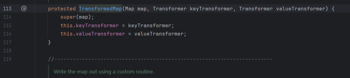 // invokerTransformer.transform(r);Map<Object, Object> map = new HashMap<>();map.put("hello","world");Map<Object, Object> transformermap = TransformedMap.decorate(map,null,invokerTransformer);