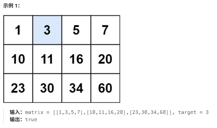 由于这是一个有序数组,我们可以用二分查找判断 target 是否在 matrix 中。一般地,有
