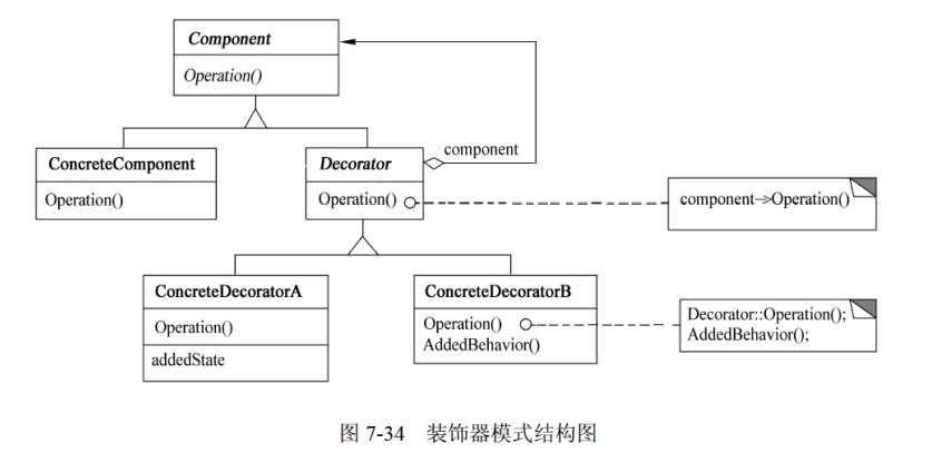 (3)抽象装饰(Decorator)角色 : 继承或实现抽象构件,并包含具体构件的实例,可以通过其子类扩展具体构件的功能。