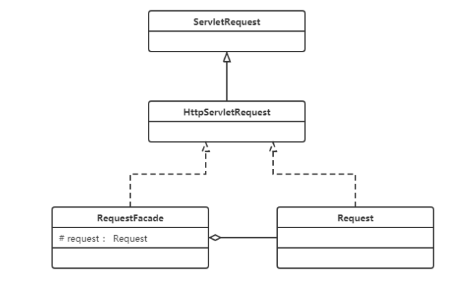 定义 RequestFacade 类,分别实现 ServletRequest ,同时定义私有成员变量 Request ,并且方法的实现调用 Request 的实现。然后,将 RequestFacade上转为 ServletRequest 传给 servlet 的 service 方法,这样即使在 servlet 中被下转为 RequestFacade ,也不能访问私有成员变量对象中的方法。既用了 Request ,又能防止其中方法被不合理的访问。