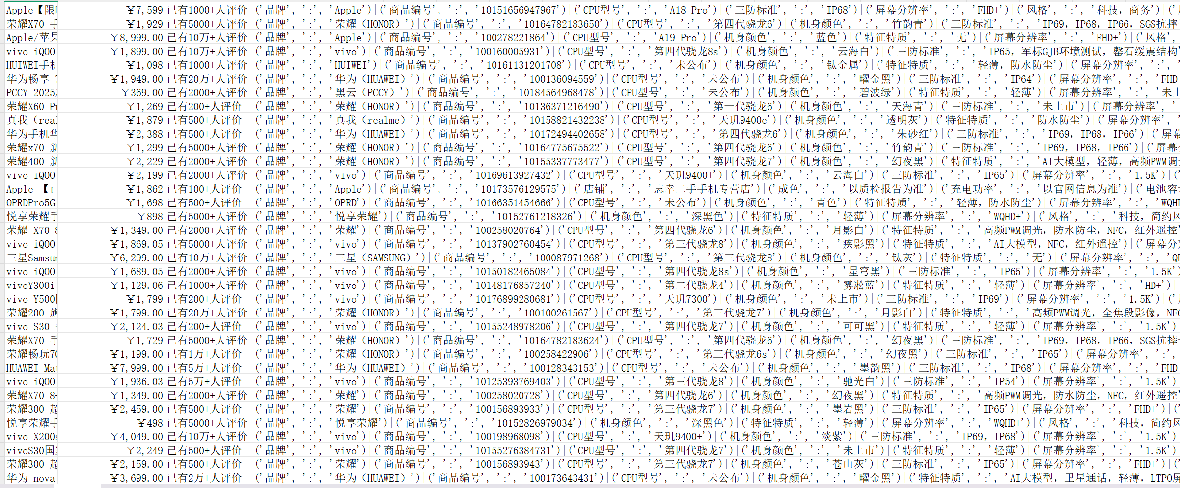 jd_firstpage_url = "https://www.jd.com"class JDMobileSpider:def __init__(self):#login_cookies = self.get_cookies()self.driver = Noneself.data = []self.headers = {'User-Agent':'Mozilla/5.0 (Windows NT 10.0; Win64; x64) AppleWebKit/537.36 (KHTML, like Gecko) Chrome/81.0.4044.113 Safari/537.36','Connection': 'keep-alive','Accept': 'text/html,application/xhtml+xml,application/xml;q=0.9,image/webp,*/*;q=0.8',#'Cookie': login_cookies}def init_edge_browser(self,url):"""初始化Edge浏览器驱动"""try:# 设置Edge浏览器选项edge_options = Options()# 常用配置选项edge_options.add_argument('--disable-blink-features=AutomationControlled')edge_options.add_experimental_option("excludeSwitches", ["enable-automation"])edge_options.add_experimental_option('useAutomationExtension', False)edge_options.add_argument('--no-sandbox')edge_options.add_argument('--disable-dev-shm-usage')# 初始化Edge浏览器self.driver = webdriver.Edge(options=edge_options)# 隐藏自动化特征self.driver.execute_script("Object.defineProperty(navigator, 'webdriver', {get: () => undefined})")# 设置窗口大小self.driver.set_window_size(1400, 900)print("Edge浏览器初始化成功")time.sleep(1)print("正在打开京东登录页面...")self.driver.get(url)time.sleep(3)return Trueexcept Exception as e:print(f"Edge浏览器初始化失败: {e}")return Falsedef jd_login(self, username, password):"""京东账号登录(使用Edge浏览器)"""try:# 等待页面加载并切换到账户登录WebDriverWait(self.driver, 10).until(EC.presence_of_element_located((By.ID, "loginname")))# 尝试点击账户登录标签#try:# account_login = self.driver.find_element(By.XPATH, "//*[@id='loginsubmit']")# account_login.click()# time.sleep(3)#except:# print("未找到账户登录标签,可能已是账户登录模式")# 输入用户名print("正在输入用户名...")user_input = self.driver.find_element(By.ID, "loginname")user_input.clear()user_input.send_keys(username)time.sleep(3)# 输入密码print("正在输入密码...")pwd_input = self.driver.find_element(By.ID, "nloginpwd")pwd_input.clear()pwd_input.send_keys(password)time.sleep(3)# 点击登录按钮print("正在点击登录按钮...")submit_btn = self.driver.find_element(By.ID, "loginsubmit")submit_btn.click()# 等待登录结果time.sleep(5)# 处理滑块验证try:# 设定一个等待时间,检查滑块验证码元素是否出现print("正在处理特殊验证码...")wait = WebDriverWait(self.driver, 5) # 等待最多10秒slider = wait.until(EC.presence_of_element_located((By.XPATH, "/html/body/div[4]/div/div/div/div[2]/span[1]"))) # 使用京东滑块验证码的相关类名:cite[1]if slider:print("检测到滑块验证码,请手动完成滑动...")input("完成后,请在控制台按回车键继续...") # 程序在此暂停,等待用户操作:cite[3]except Exception as e:# 如果在设定时间内没有找到滑块元素,可能直接登录成功或出现了其他情况print("未检测到滑块验证码,或验证码形式有变化:", e)# 验证登录是否成功# 手动滑动完成后,检查登录是否成功try:#等待页面跳转并检查用户昵称元素WebDriverWait(self.driver, 10).until(EC.presence_of_element_located((By.CLASS_NAME, "nickname")) # 登录成功后会出现昵称元素)print("登录成功!")except Exception as e:print("登录可能失败,请检查:", e)except Exception as e:print("登录可能失败1,请检查:", e)def get_mobile_data(self, pages=3):"""获取手机数据(每页约40个商品,3页约120个确保获取前60畅销)Args:keyword: 搜索关键词pages: 爬取页数"""try:all_products_labels = ["商品名称","价格","评论数","商品详情"]all_products = []for page in range(1, pages + 1):jd_search_url = f"https://re.jd.com/search?keyword=%E4%BA%AC%E4%B8%9C%E6%89%8B%E6%9C%BA%E8%87%AA%E8%90%A5&page={page}&ad_od=3&re_dcp=21Sm2D2ZOw&traffic_source=1004&bd_vid=9286869643b8e0c2&cu=true&utm_source=haosou-search&utm_medium=cpc&utm_campaign=t_262767352_haosousearch&utm_term=63857745620_0_9998f764b1f84bdd80ee784885202003"print(f"正在爬取第{page}页数据...")# 京东搜索URLself.driver.get(jd_search_url)original_window = self.driver.current_window_handletime.sleep(5)# 模拟滚动加载所有商品#self.scroll_page()for i in range(5):self.driver.execute_script('window.scrollBy(0, 100)')time.sleep(1)# 解析当前页商品j = 0print("获取商品数据中...")products = self.driver.find_elements(By.XPATH, "//*[@id='shop_list']/li")for product in products:try:price = product.find_element(By.XPATH, ".//*[@class='price']").text.strip()name = product.find_element(By.XPATH, ".//*[@class='commodity_tit']").text.strip()comment_count = product.find_element(By.XPATH, ".//*[@class='comment']").text.strip()print(f"第{j+1}个商品:")print(f"名字: {name}, 价格: {price}, 评论数: {comment_count}")time.sleep(3)except Exception as e:print("未找到商品元素,跳过此商品")continuetry:print("正在获取商品链接...")link_element = product.find_element(By.XPATH, ".//div/div[1]/a")link_element.click()time.sleep(6)#link = link_element.get_attribute("href")except Exception as e:print(f"未找到商品链接: {e}")WebDriverWait(self.driver, 10).until(EC.number_of_windows_to_be(2))windows = self.driver.window_handlesfor window in windows:if window != original_window:self.driver.switch_to.window(window)print("切换到新窗口:", self.driver.current_url)breaktry:details = []print("正在获取手机详情数据...")time.sleep(5)#self.check_if_need_login()WebDriverWait(self.driver, 10).until(EC.presence_of_element_located((By.CLASS_NAME, "nickname")) #登录成功后会出现昵称元素)self.driver.execute_script('window.scrollBy(0, 200)')time.sleep(3)#input("等待继续执行,请在控制台按回车键继续...") # 程序在此暂停,等待用户操作infs = self.driver.find_element(By.XPATH, "//*[@id='detail']/div[2]/div[3]/div[2]")inf_labels = infs.find_elements(By.XPATH, ".//*[@class='flex-center']")inf_values = infs.find_elements(By.XPA