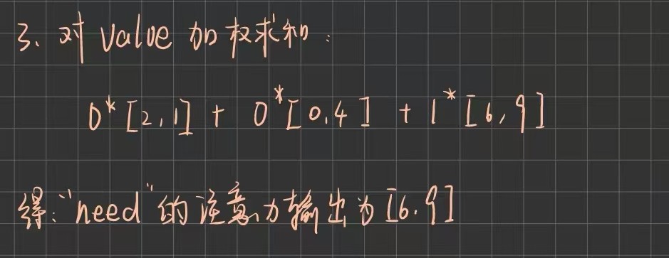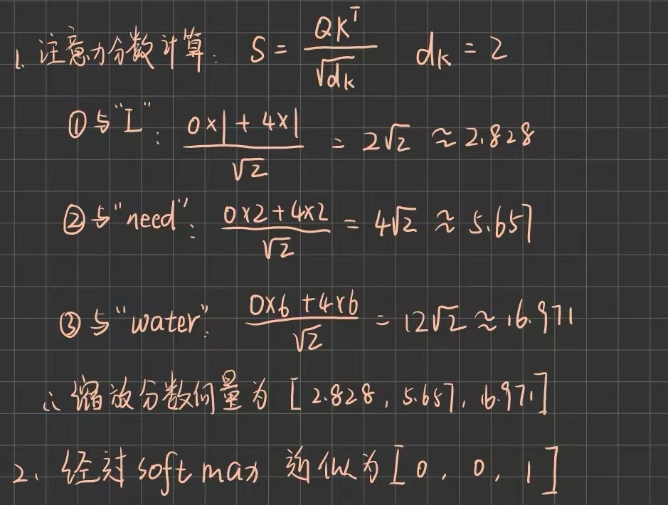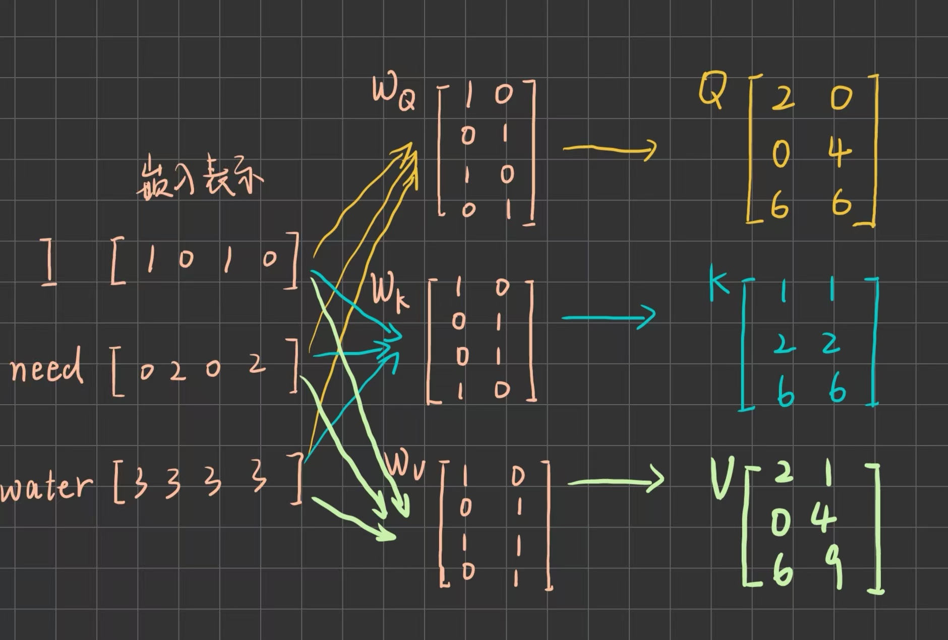 可以发现,need 的注意力输出完全来自于 water 的 Value 向量,明显不合理,这是因为这只是一个以供学习的例子,权重矩阵是任意设定的,并不一定合理,在实际的应用中需要通过大量的数据训练得到能够合理地反映语义相似性的权重。