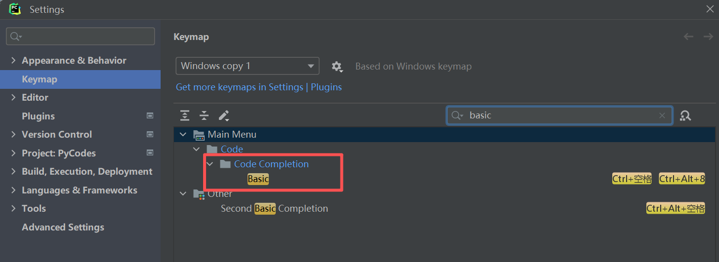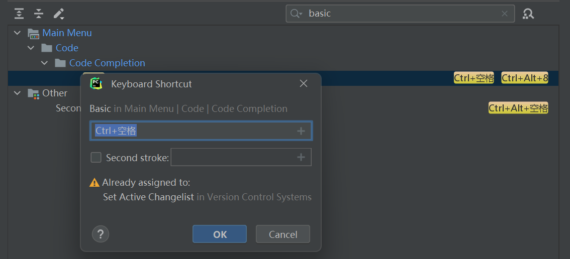 如果你不想修改输入法设置,也可以在 PyCharm 内部为“基本代码补全”重新绑定一个快捷键。