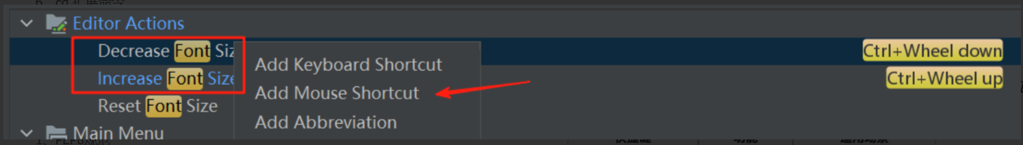 File→Settings→Keymap,搜索“Font”查找并编辑Editor Actions下的Decrease Font Size和Increase Font Size属性。在Add Mouse Shortcut中,配置为: