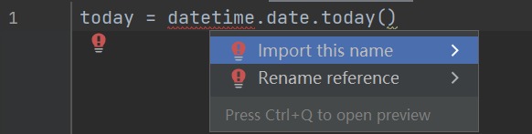 后,会弹出一个菜单:选择 "Import 'datetime'" 后,代码顶部会自动添加import datetime