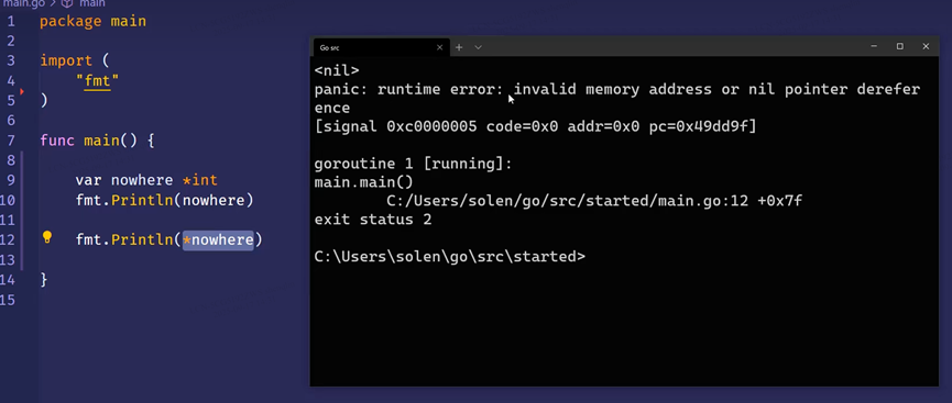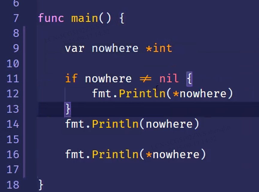 如果指针没有明确的指向,那么程序将无法对其实施解引用,尝试解引用一个nil指针将导致程序崩溃。