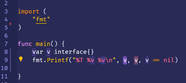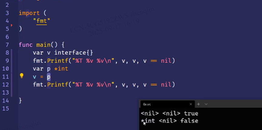 在Go中,接口类型的变量只有在类型和值都为nil时才等于nil,即使接口变量的值仍为nil,但只要它的类型不是,那么该变量就不等于nil。