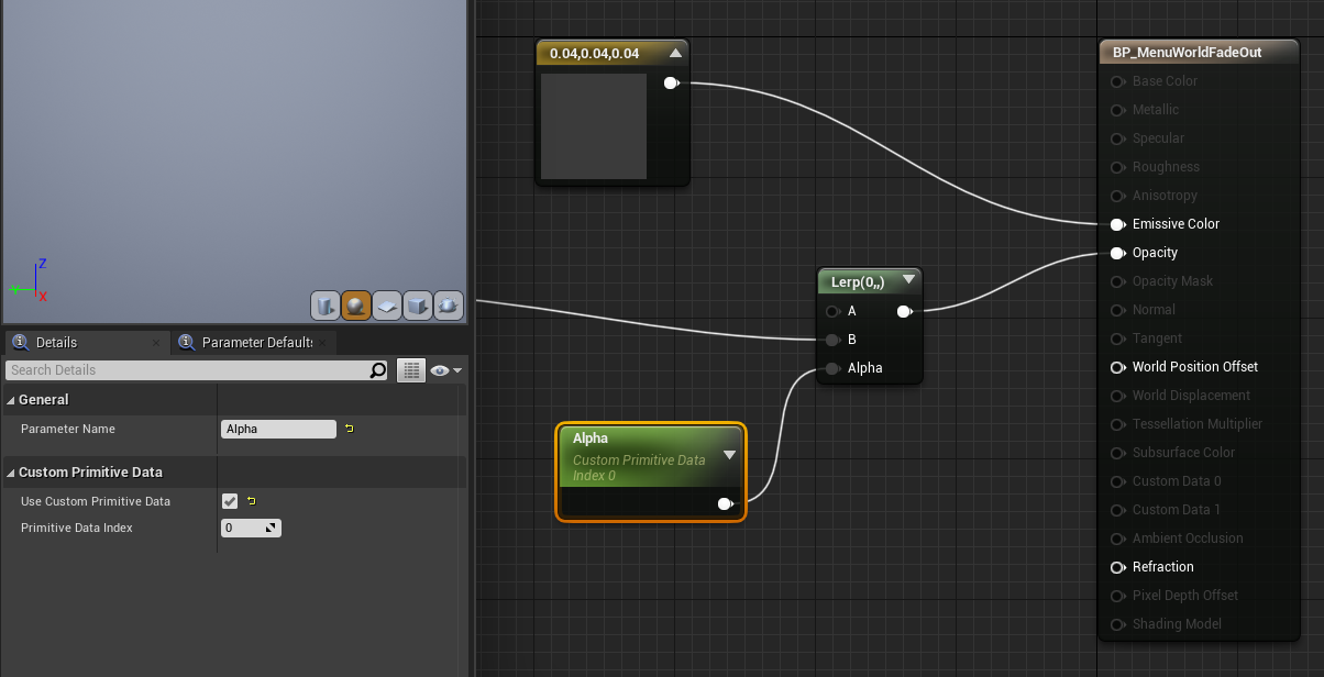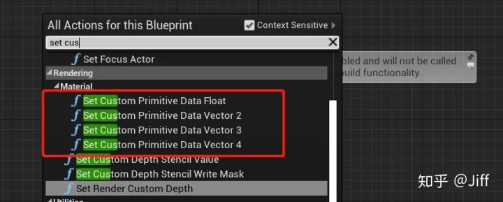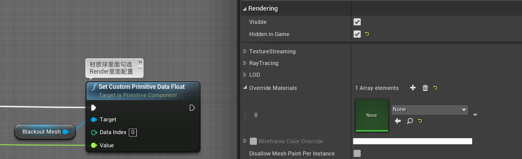 传递参数给Custom Primitive Data,编辑器面板在Rendering下面的Custom Primitive Data可以增删相应的数据,蓝图中,有Set Custom Primitive Data从float到Vector4四个函数