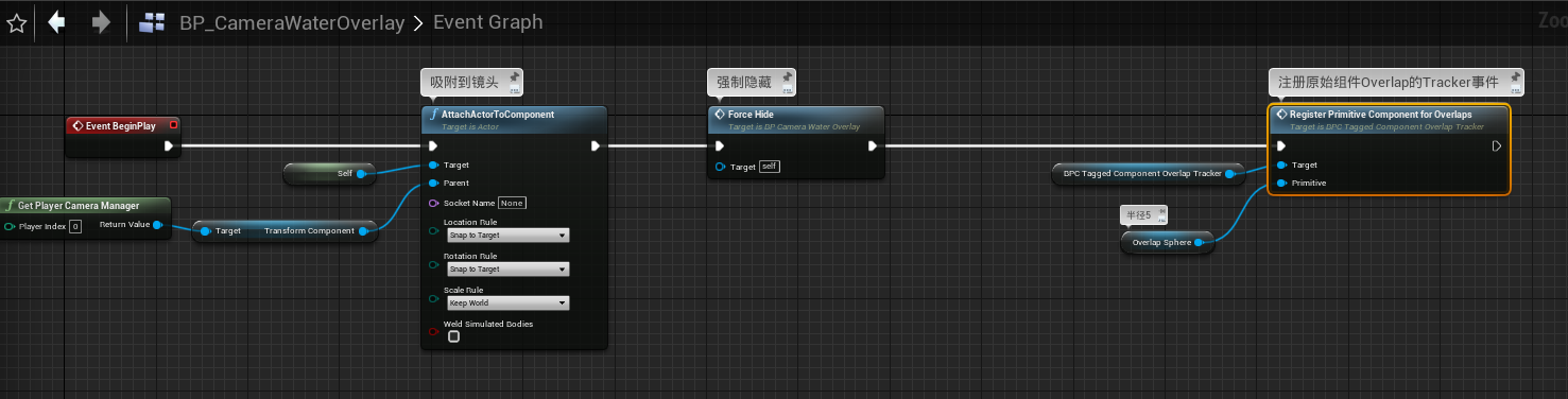 初始化创建对象: BP_MenuController菜单UI、BP_VRSpectator观察着、BP_PlayerVignette黑圈视野、BP_CameraWaterOverlay水下视野